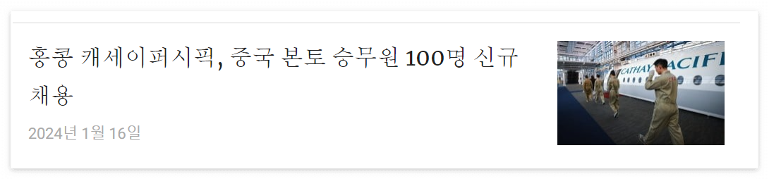 - 캐세이퍼시픽의 인력 부족 문제 - 캐세이퍼시픽은 2020년 10월에 5,300명의 직원을 해고하고 지역 항공사인 Dragonair를 폐쇄하는 등의 절박한 구조조정을 실시했음. 이로 인해 인력 부족에 시달렸으며, 2024년에 5,000명의 직원을 추가로 고용할 계획이라고 밝혔음. 특히 조종사 부족으로 인해 지난 크리스마스 이브 이후 160여 개의 항공편이 취소되었음.