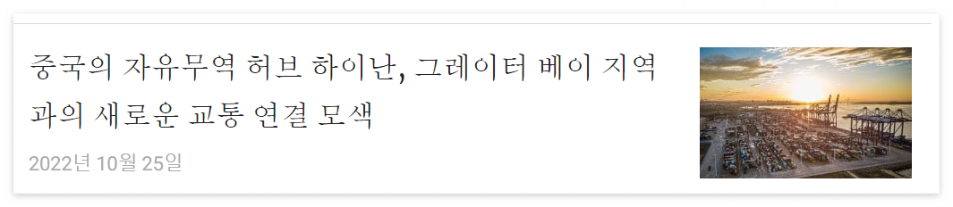 - 하이난 섬과 대만만의 교통 연결의 중요성: 하이난 섬과 대만만의 교통 연결은 하이난 섬의 성공에 결정적인 역할을 할 것이다. 대만만은 광동성의 9개 도시와 홍콩, 마카오를 포함한 경제 강국이다. 하이난 섬은 남중국해에서 중국의 거점이 되고, RCEP에 참여하는 동남아시아 국가들과의 무역을 활성화할 수 있는 역할을 할 것이다. RCEP은 동남아시아 10개국을 포함한 약 15개국으로 구성되어 있으며, 전 세계 인구의 약 3분의 1과 전 세계 GDP의 약 30%를 차지한다.