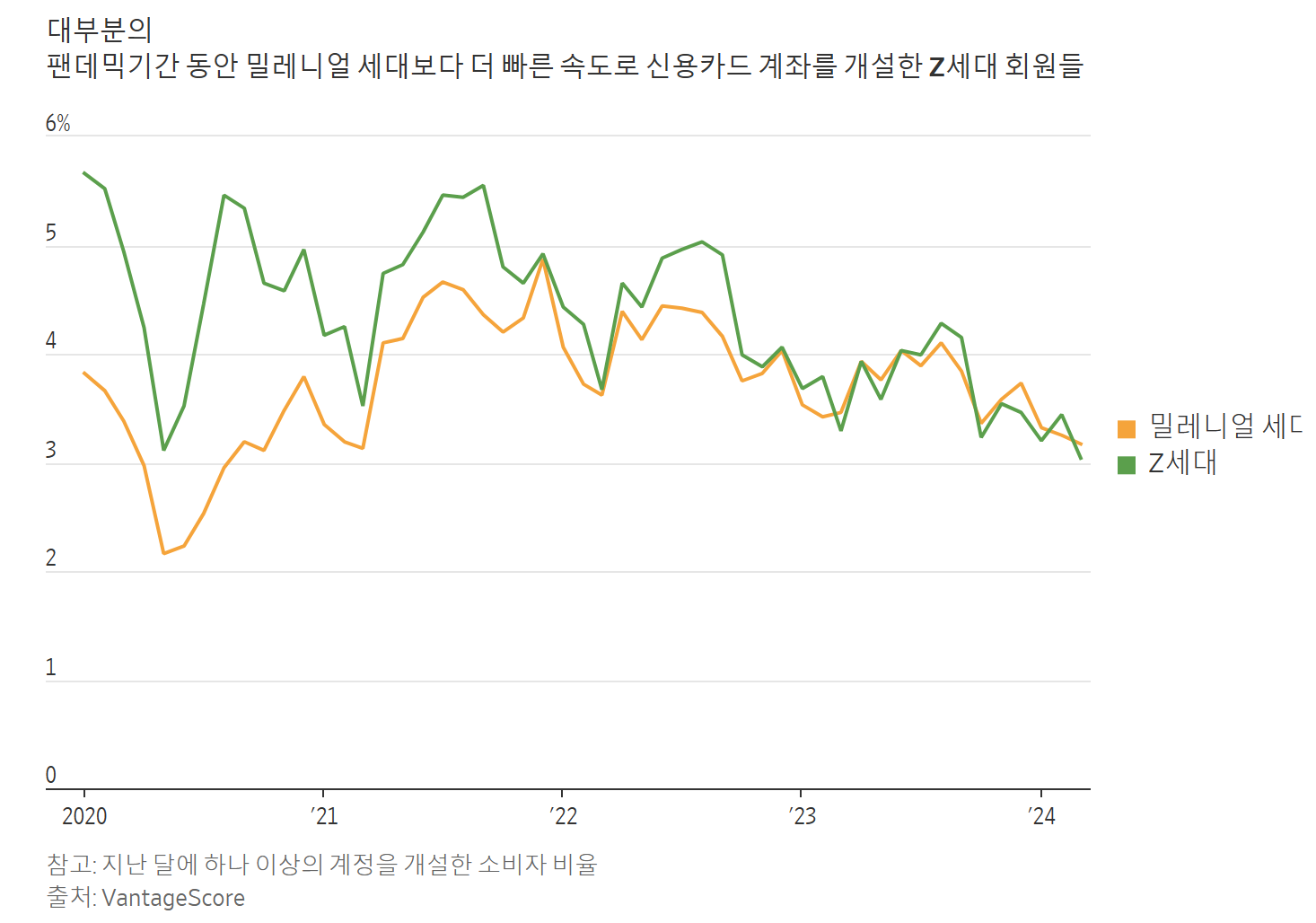 (3) 데이터 출처: 차트 하단에는 지난 달에 적어도 한 개의 계정을 개설한 소비자의 백분율을 나타내는 데이터가 VantageScore에서 제공되었다는 메모가 있습니다.
