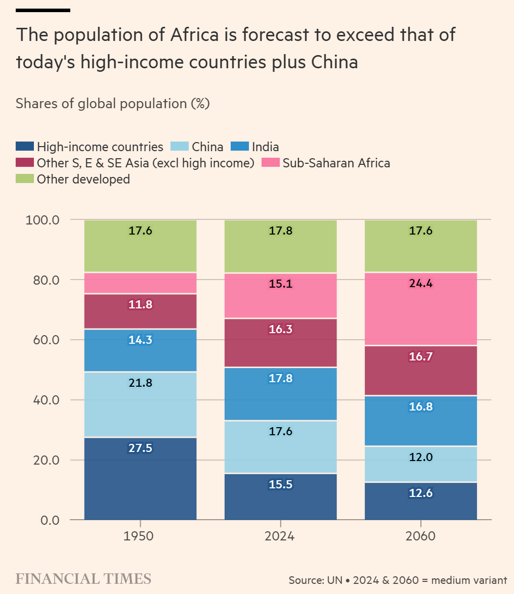 | Copilot 차트 설명 이 차트는 "아프리카 인구는 오늘날의 고소득 국가들과 중국의 인구를 초과할 것으로 예측된다"라는 제목의 막대 그래프입니다. 1950년부터 2100년까지 다양한 지역의 인구(십억 단위)를 비교하고 있으며, 아프리카, 고소득 국가들(중국 제외), 그리고 중국의 역사적 데이터와 예측치를 보여줍니다. 막대는 색상으로 구분되어 있습니다: 아프리카는 녹색, 고소득 및 동남아시아 국가들(고소득 국가 제외)은 분홍색, 기타 선진국은 파란색, 중국은 빨간색입니다.