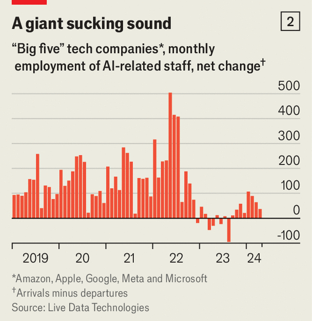 이 이미지는 2019년부터 2024년 초까지 '빅 5' 기술 기업(아마존, 애플, 구글, 메타, 마이크로소프트)의 AI 관련 직원의 월별 순 고용 변화를 보여주는 '거대한 빨아들이는 소리'라는 제목의 막대 그래프입니다. 데이터는 라이브 데이터 테크놀로지스에서 제공한 것입니다.