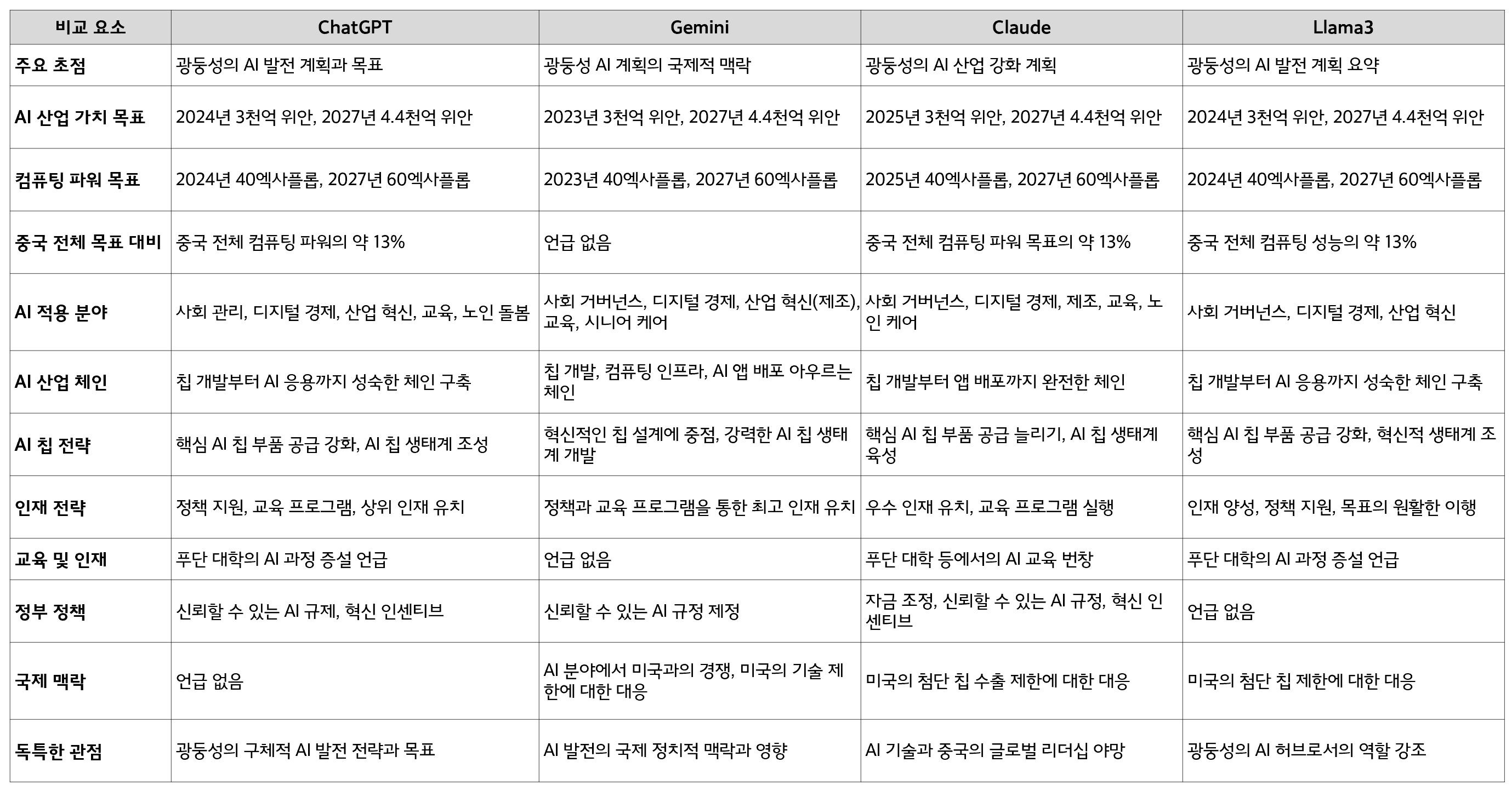 - ChatGPT는 광둥성의 구체적인 AI 발전 계획과 목표에 가장 중점을 두어, 지방 정부 차원의 AI 전략을 상세히 설명합니다.