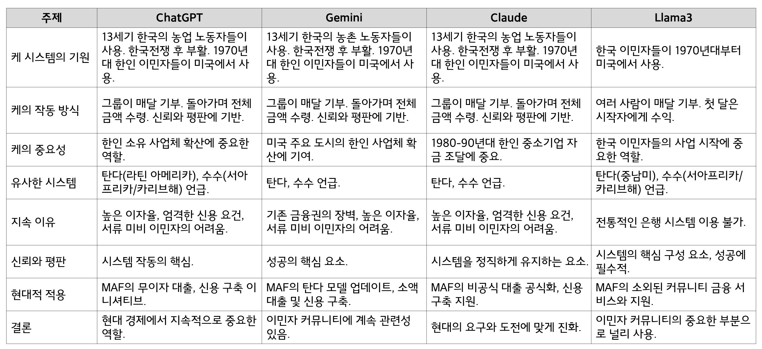 네 개의 AI 모델(Chat GPT, Gemini, Claude, Llama3)이 제공한 요약 비교 표