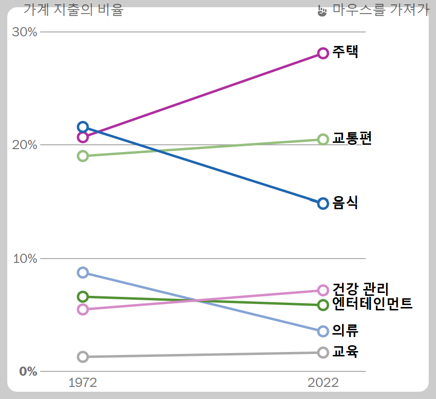 - 가계 지출 변화: 1972년 이후 의료비, 주거비, 교육비는 증가한 반면, 음식, 의복, 교통비 지출은 감소했습니다.