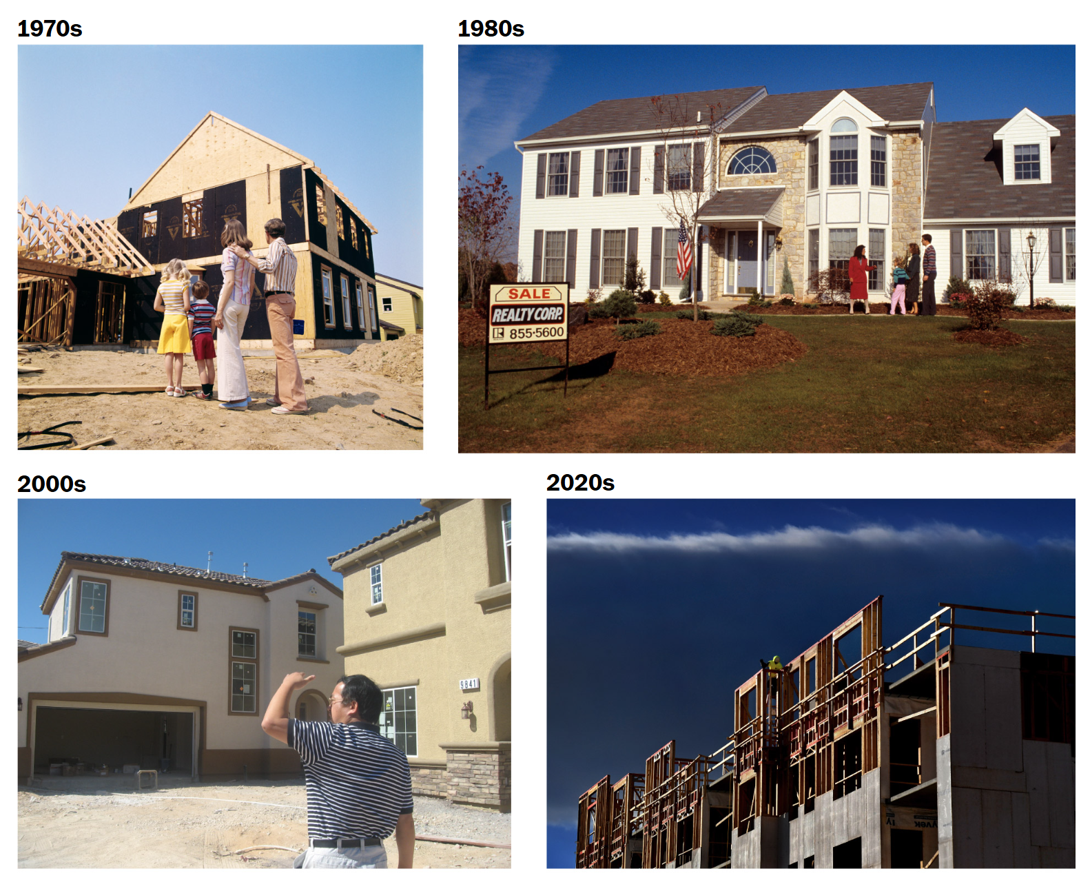 이 이미지는 1970년부터 2020년까지 세입자와 주택 소유자의 총 가계 지출 대비 주거 비용을 비교한 그래프입니다. 주요 요점은 다음과 같습니다: