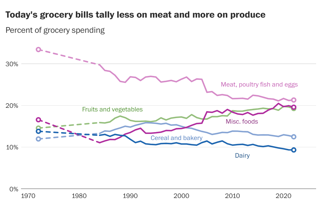 -1970년에는 미국 가계의 식료품 지출의 30%가 육류, 가금류, 생선 및 계란에 사용되었습니다. 이 비율은 2020년에는 18%로 감소했습니다.