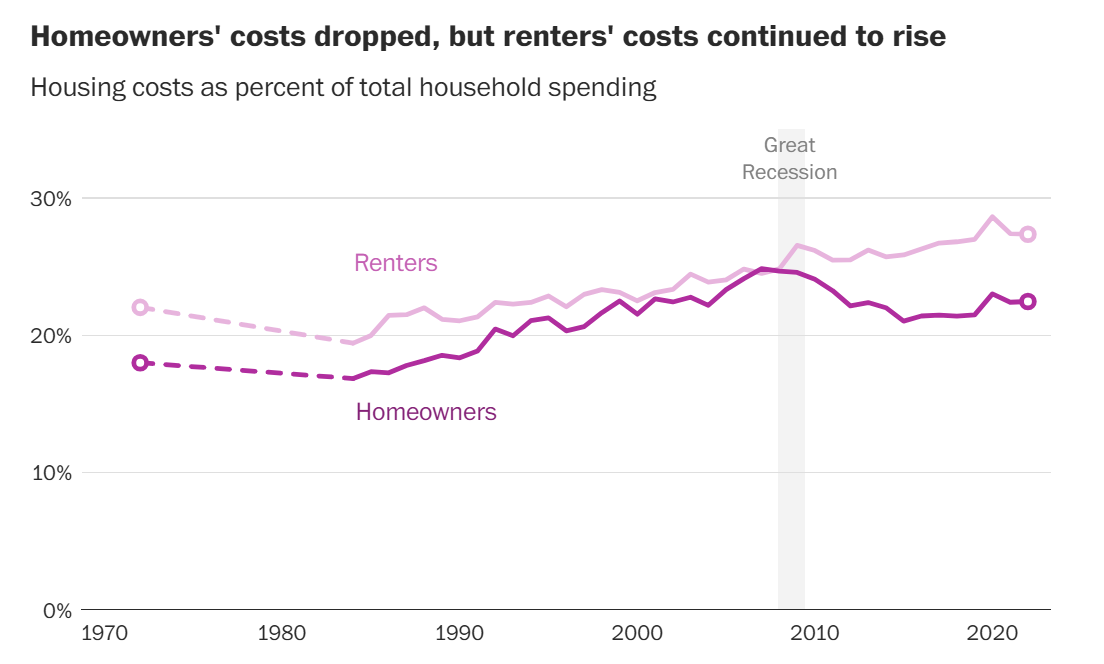 이 그래프는 특히 최근 몇 년 동안 임차인과 주택 소유자 간의 주거 비용 격차가 커지고 있음을 보여줍니다.