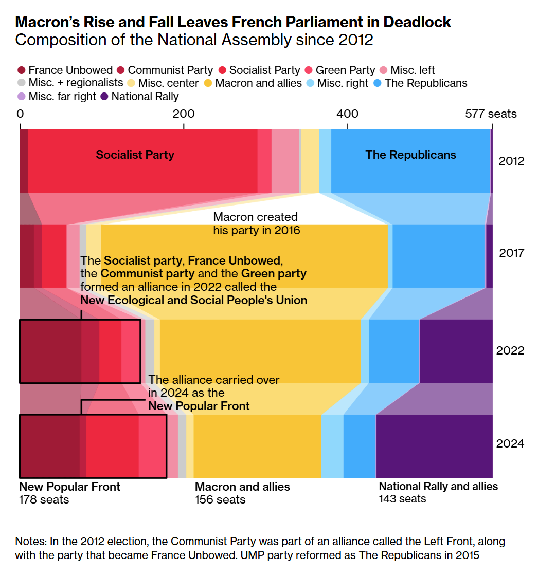 이 차트는 2012년부터 2022년까지 프랑스 국민의회의 구성을 시각화한 것으로, 시간에 따른 다양한 정당의 부상과 하락을 보여줍니다. 특히 2016년에 마크롱이 창당한 정당의 변화에 초점을 맞추고 있으며, 이로 인해 의회에서 교착 상태가 발생했다고 설명합니다. 색상 사용: 다양한 정당을 대표하는 색상을 사용하여, 사회당은 분홍색, 마크롱의 정당은 연한 파란색, 공화당은 진한 파란색, 녹색당은 녹색, 공산당과 극좌 동맹은 빨간색, 그리고 기타 그룹은 다른 색상으로 표시됩니다. 주요 사건: 2016년 마크롱이 자신의 정당을 창당하고, 2022년에 사회당과 프랑스 불복종당이 연합을 형성한 것과 같은 주요 사건에 대한 주석이 포함되어 있습니다. 의회 구성: 차트는 2012년 선거에서 공산당이 좌파 전선의 일부였고, UMP 정당이 2015년에 공화당으로 개편된 것과 같은 의회 구성의 변화를 보여줍니다. 이 차트는 프랑스 정치 풍경이 지난 10년 동안 얼마나 크게 변화했는지를 잘 보여주며, 현재 의회의 교착 상태를 이해하는 데 도움이 됩니다.