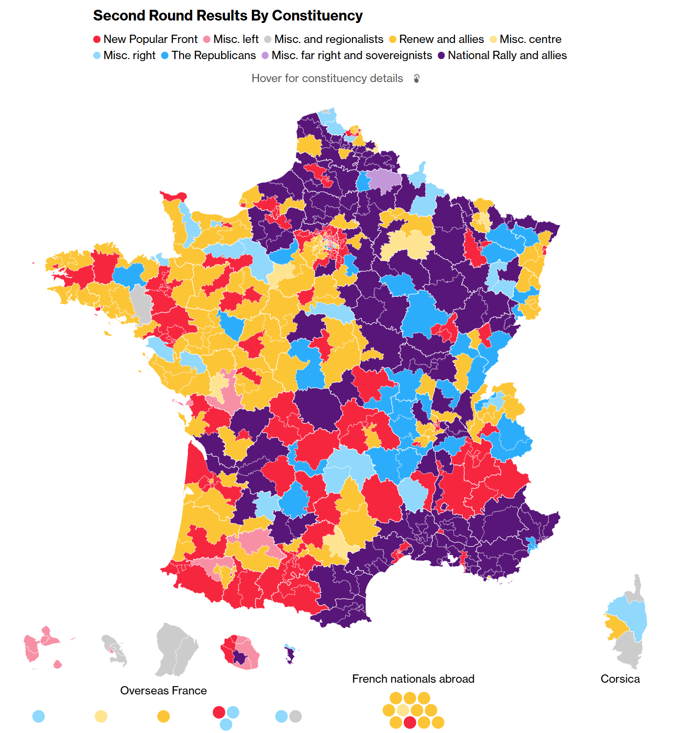 이 차트는 프랑스 국회의원 선거 결과를 지역별로 나타낸 것입니다. 각 색깔은 다른 정치 그룹이나 연합을 나타내며, 선거구별로 어떤 정당이 승리했는지 보여줍니다. 예를 들어, 새로운 대중 전선, 갱신 및 동맹, 공화당 등이 있습니다. 또한 해외 프랑스인과 코르시카 지역도 별도로 표시되어 있습니다. 이 차트는 마우스를 올려 선거구의 자세한 정보를 볼 수 있는 인터랙티브한 요소를 포함하고 있습니다. 새로운 대중 전선: 좌파 연합으로 가장 많은 의석을 확보했지만 절대 과반수에는 미치지 못했습니다. 갱신 및 동맹: 마크롱 대통령의 중도파 연합으로, 좌파 연합에 이어 두 번째로 많은 의석을 차지했습니다. 국민 집회 및 동맹: 마린 르펜의 극우 정당으로, 이번 선거에서 의석을 늘렸지만, 여전히 좌파 연합과 중도파 연합에 뒤졌습니다. 지역별 분포: 좌파 연합과 중도파 연합은 서부 프랑스와 파리와 같은 도시 지역에서 극우파에 대항해 지지를 결집했습니다. 국민 집회는 농촌 지역과 북부 프랑스의 광산 지역에서 가장 인기가 많았습니다.
