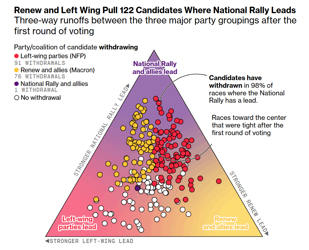 이 차트는 프랑스 국회의원 선거에서 주요 정당들 간의 전략적 후보 철회가 선거 결과에 미친 영향을 시각적으로 나타내고 있습니다. 삼각형 다이어그램은 세 주요 정치 방향을 나타내며, 각 꼭지점에는 “강한 좌파 리드”, “국민전선 리드 및 갱신 리드”, "중앙/기타 정당 리드"라고 표시되어 있습니다. 삼각형 내부에는 다양한 색상의 점들이 있으며, 이는 후보 철회의 다른 결과를 나타냅니다. 빨간색은 좌파 정당(76건의 철회), 노란색은 국민전선 및 동맹(91건의 철회), 파란색은 중앙/기타 정당(10건의 철회)을 의미합니다. 또한, 철회하지 않은 경우를 나타내는 흰색 점도 있습니다. 이 차트는 첫 번째 투표 라운드 이후 경쟁이 중앙으로 기울어지는 경향이 있음을 설명하는 주석도 포함하고 있습니다. 이 차트는 복잡한 정치 역학과 선거에서의 유권자 행동을 시각적으로 나타내는 데 흥미롭거나 관련이 있습니다.