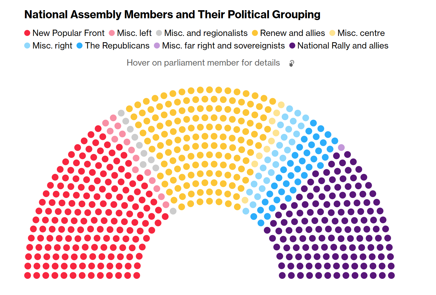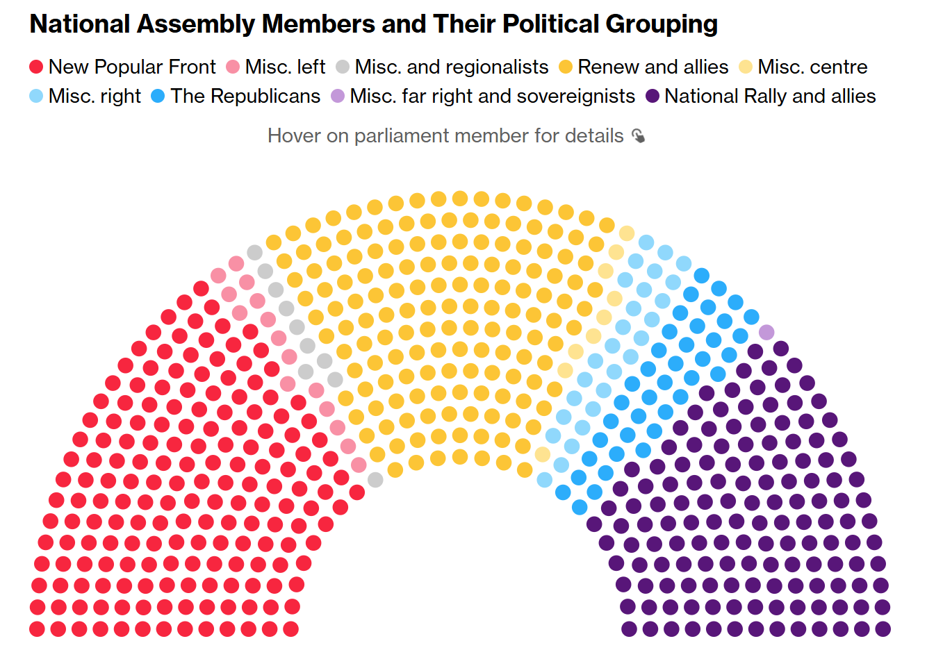 이 차트는 프랑스 국민의회의 정치적 구성을 나타내는 것으로 보입니다. 각 정당 그룹을 대표하는 색상으로 구성된 반원형 차트입니다. 차트 아래의 범례에 따르면, ‘새로운 대중 전선’, ‘기타 좌파’, ‘기타 및 지역주의자’, ‘갱신 및 동맹’, ‘기타 중앙’, ‘기타 오른쪽’, ‘공화당’, ‘기타 극우 및 주권주의자’, ‘국민 집회 및 동맹’ 등의 정치 그룹이 있습니다. 이 차트는 특정 지역의 입법 기관 내에서 정치적 성향을 한눈에 파악할 수 있게 해줍니다.