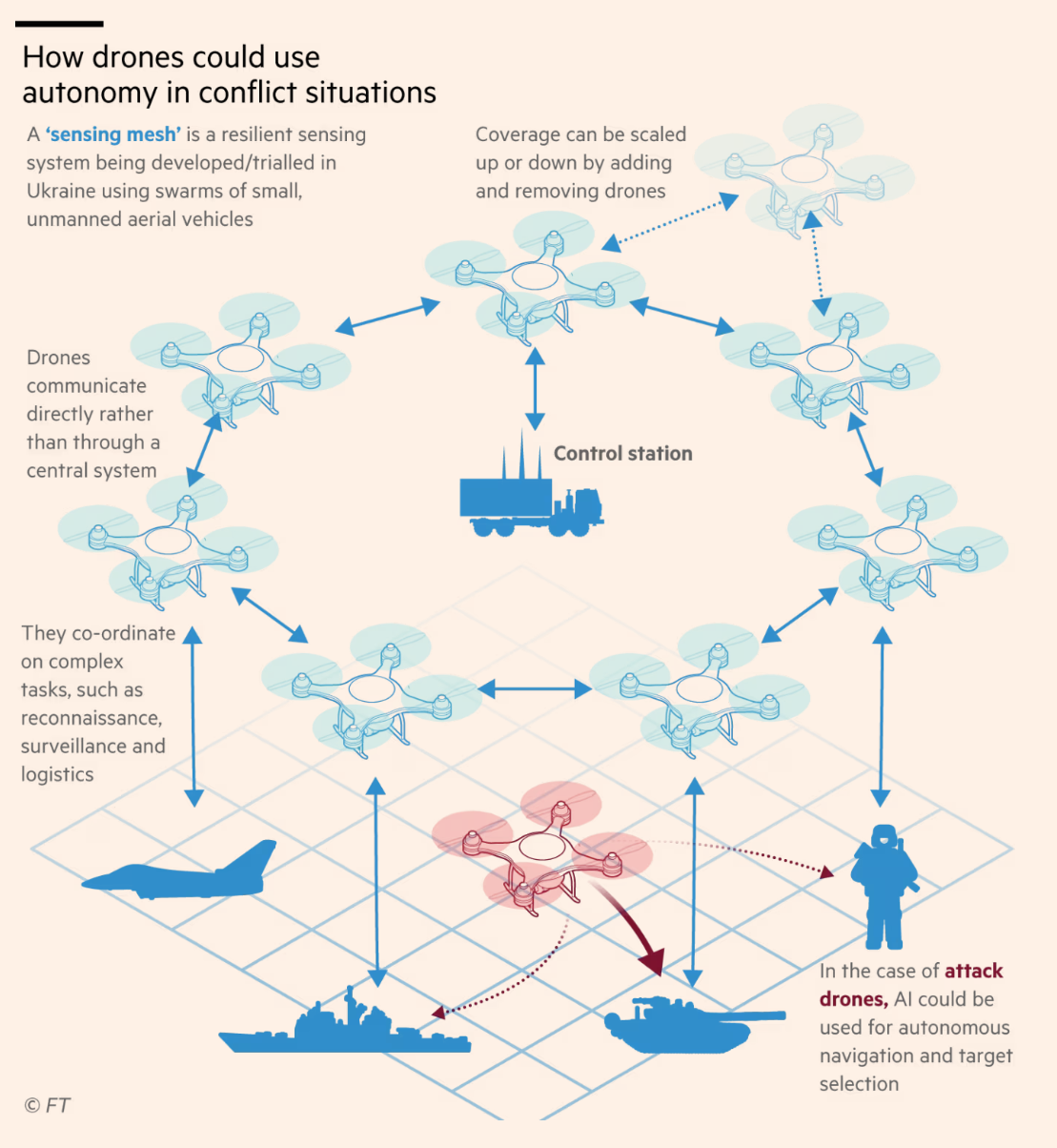 이 인포그래픽은 "갈등 상황에서 드론이 자율성을 어떻게 사용할 수 있는가"를 보여줍니다. 중앙 시스템이 다양한 역할을 하는 여러 그룹의 드론과 통신하고 제어하는 네트워크를 나타냅니다. 일부 드론은 감시를 제공하는 반면, 다른 드론은 물품을 전달하는 물류에 관여합니다. 인공지능을 사용한 자율 항법과 목표 선택에 대한 언급도 있습니다. 이 시스템은 드론을 추가하거나 제거함으로써 확장 또는 축소가 가능하며, 갈등 상황에서의 효과적인 가능성을 암시하는 내구성을 가지고 있다고 제안합니다.