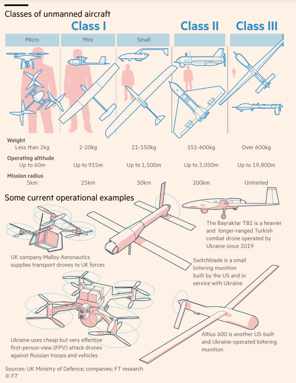 이 차트는 무인 항공기, 일명 드론을 크기, 무게, 운영 특성에 따라 세 가지 클래스로 분류합니다. Class I은 2kg 미만의 가장 작은 드론으로, 임무 반경은 25km까지입니다. Class II은 중간 크기로 2-150kg 무게에 임무 반경은 50km까지입니다. Class III은 150kg 이상의 가장 큰 드론으로, 임무 반경에 제한이 없습니다. 각 클래스 아래에는 영국의 Malloy Aeronautics사의 무인 화물 드론이나 터키의 Bayraktar TB2와 같은 특정 드론 모델에 대한 추가 정보가 있습니다. 이 차트는 교육 목적이나 항공 기술에 관심 있는 사람들에게 유용할 수 있습니다.