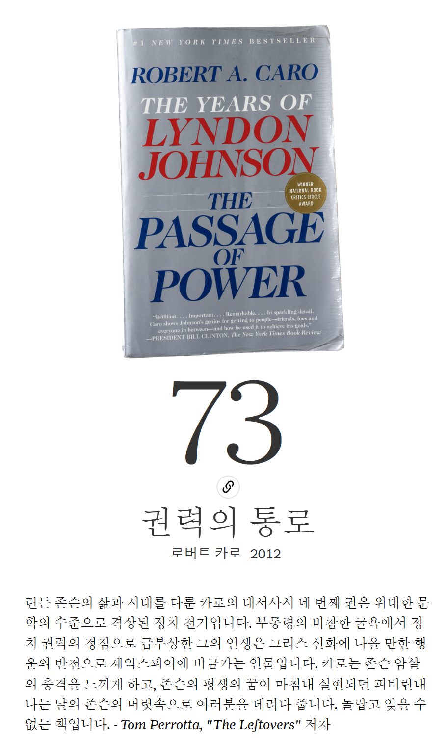 이 작품은 존슨의 삶과 국가의 삶에서 중대한 시기를 탐구하며, 대통령직의 실용적 잠재력과 국가를 변화시키려는 프로그램을 시작할 때 대통령이 달성할 수 있는 것들을 드러냅니다. 카로의 서술은 생생하고 강렬하며, 독자들에게 미국 역사의 중요한 순간들을 새로운 시각으로 경험하게 합니다.