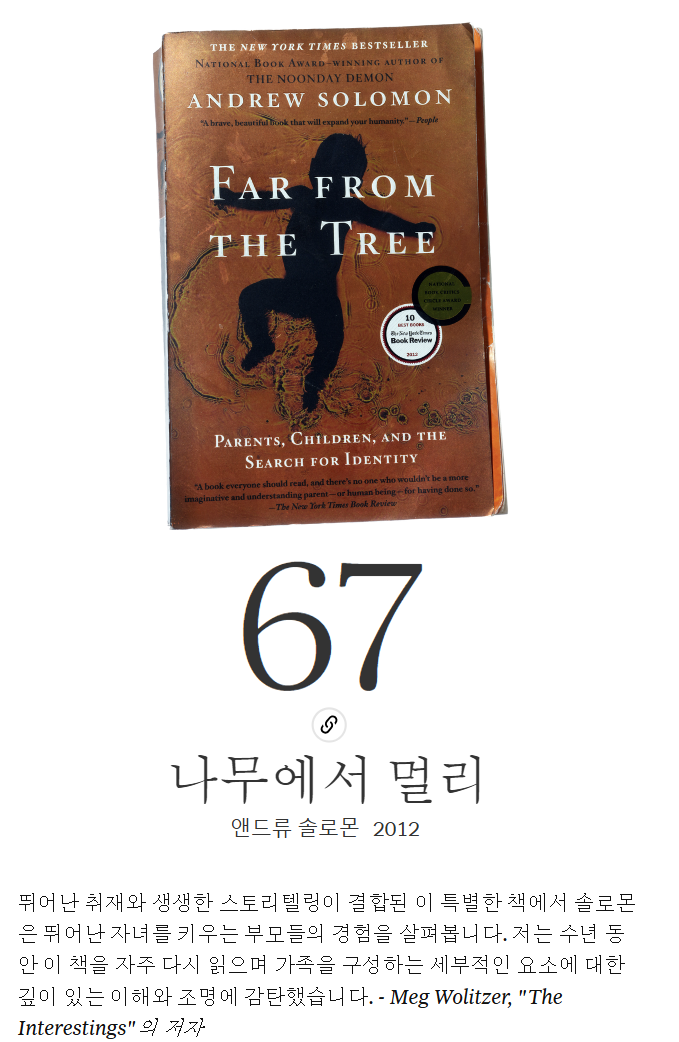 "Far From the Tree"는 앤드류 솔로몬(Andrew Solomon)이 쓴 책으로, 부모와 매우 다른 아이들을 둔 가족들의 이야기를 다룹니다. 솔로몬은 청각 장애, 난쟁이, 다운 증후군, 자폐증, 정신분열증, 중증 장애를 가진 아이들, 천재 아이들, 강간으로 잉태된 아이들, 범죄를 저지른 아이들, 트랜스젠더 아이들 등 다양한 특성을 가진 아이들을 둔 가족들의 경험을 통해 다양성이 우리를 하나로 묶는 것이라는 주장을 펼칩니다.