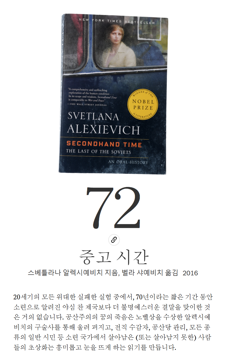 이 책에 대한 리뷰를 작성하자면, "Secondhand Time"은 소련의 붕괴가 개인과 사회에 미친 영향에 대한 섬세하고 깊이 있는 개인적 탐구를 제공합니다. 알렉시예비치는 인터뷰를 통해 전 소비에트 연방의 사람들의 목소리를 수집하여, 공산주의의 붕괴에 대한 그들의 반응을 생생하게 전달합니다. 이 책은 소련의 붕괴 동안의 삶과 그 이후의 새로운 러시아에서의 삶을 보여주는 일상적인 러시아 시민들의 이야기를 담고 있습니다.