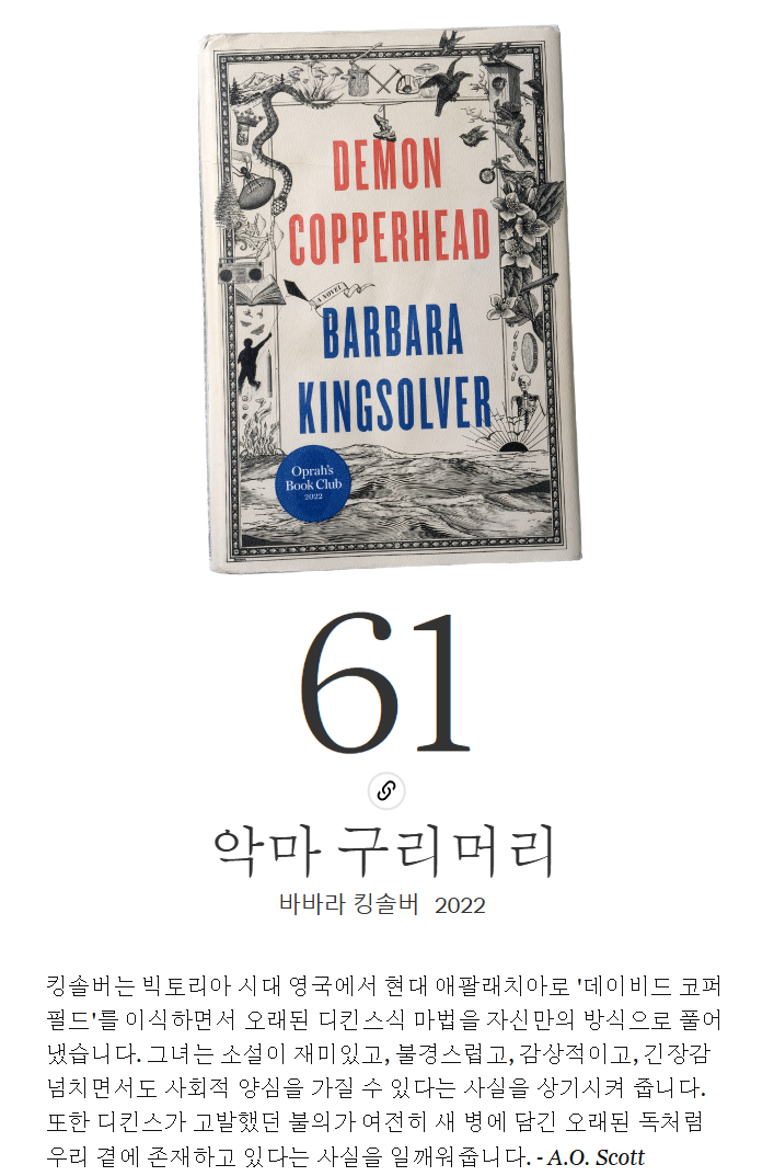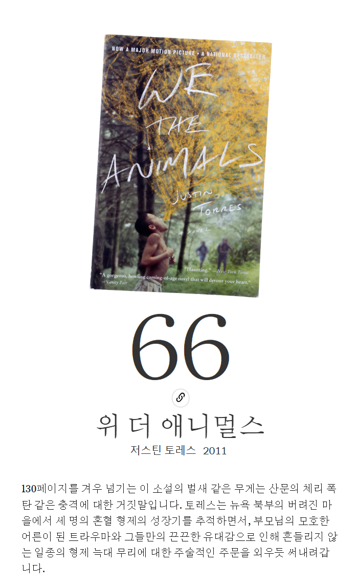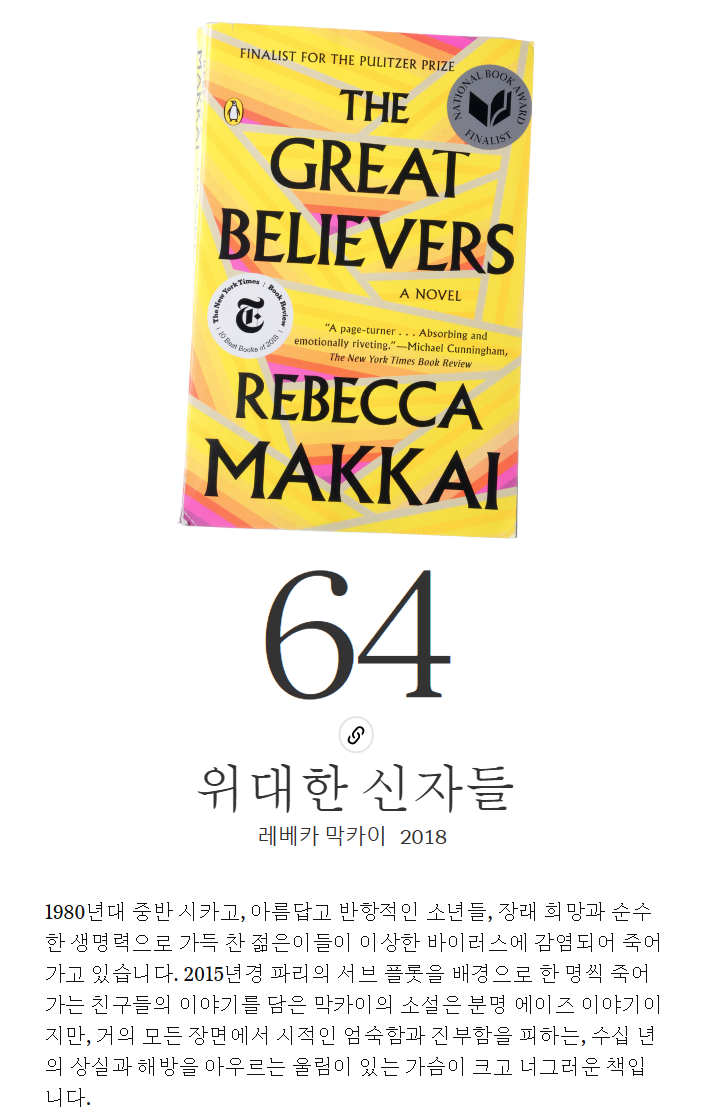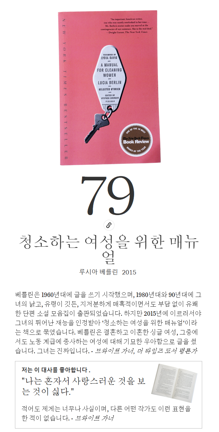 이번 주(오늘부터 80~61일)에 걸쳐 이 목록을 공개하면서 꼭 읽어보고 싶었던 책을 발견하거나, 다시 읽고 싶은 명작을 만나게 되기를 바랍니다. 무엇보다도 여기에 소개된 다양한 주제, 목소리, 의견, 경험, 상상력에서 여러분도 저희만큼이나 많은 영감을 얻고 눈부시게 빛나시길 바랍니다.