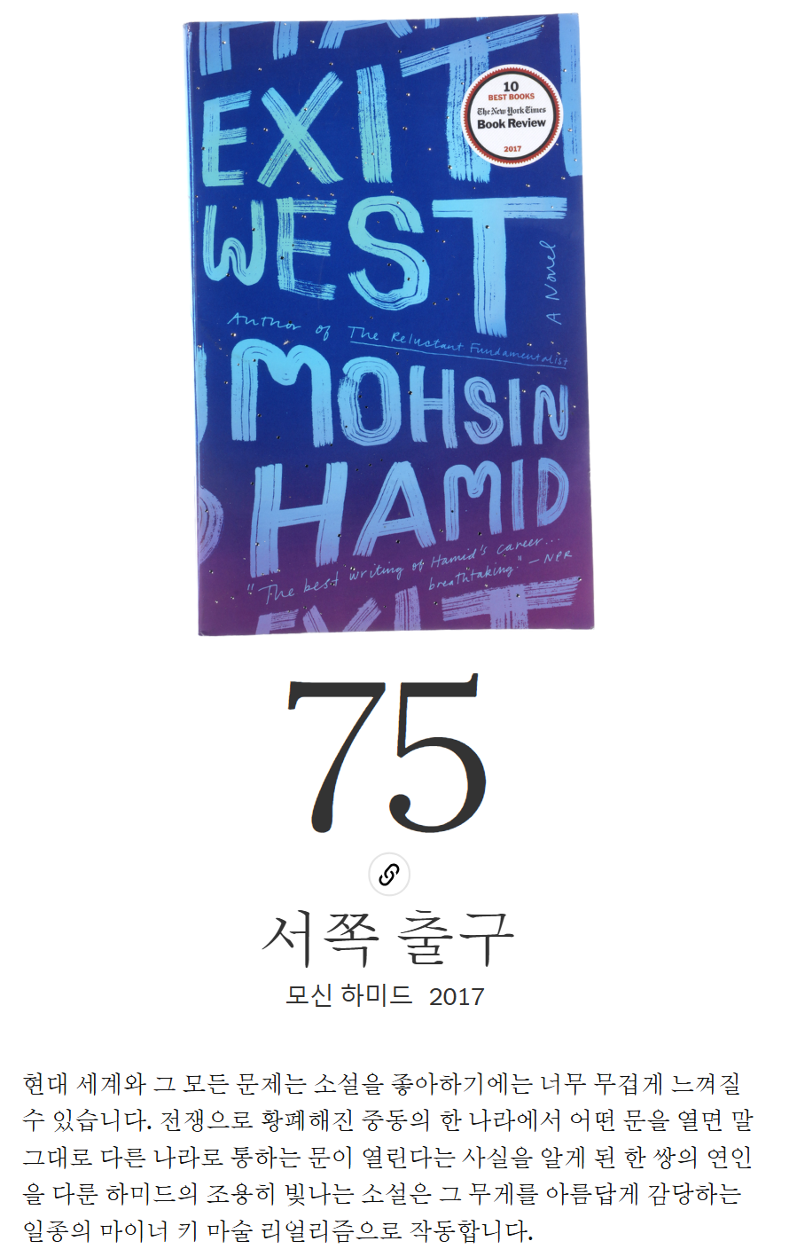 이 소설에 대한 리뷰를 작성하자면, "Exit West"는 전쟁과 갈등의 세계에서 사랑과 피난처를 찾는 젊은 커플의 여정을 탐구하는 작품입니다. 하미드는 이 소설을 통해 이민과 난민 문제에 대한 주요한 주제를 다루며, 사랑, 충성, 용기의 이야기를 현대적이면서도 영원한 방식으로 전달합니다. 이 작품은 인간의 존엄성을 강조하면서도, 난민이 되는 경험이 개인에게 어떤 영향을 미치는지, 그리고 그들이 난민으로서 겪는 정체성의 변화를 섬세하게 묘사합니다.