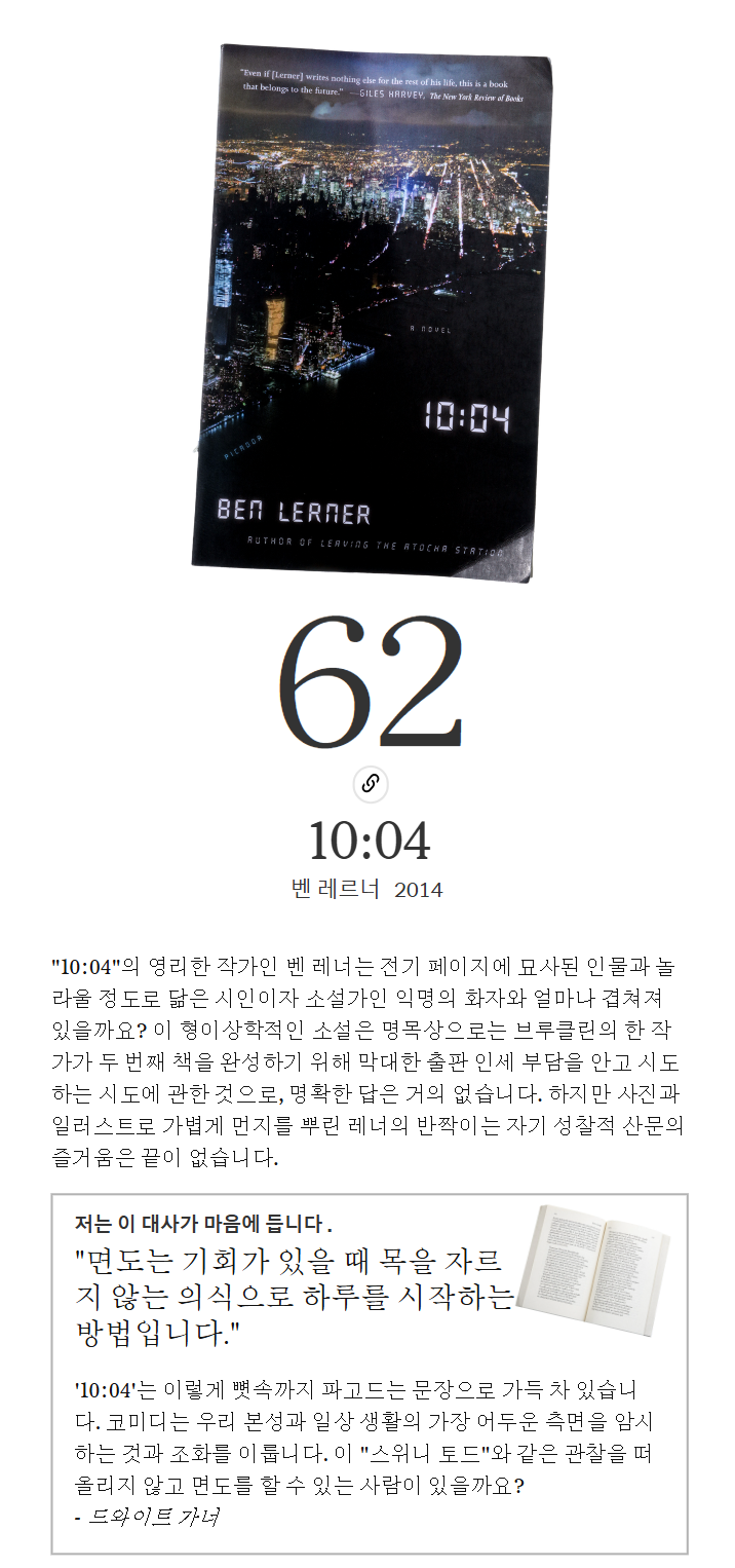 이 소설에 대한 리뷰를 작성하자면, "10:04"는 문학이 포스트모던 시대에 어떤 역할을 하는지에 대한 우아하고 혼란스러운 명상입니다. 이야기는 화자가 자신의 계약을 이행하기 위해 단편 이야기를 소설로 확장하려고 시도하는 일년간의 기본적인 사건과 관계를 묘사합니다. 이 소설은 작가가 자신의 예술적 목적을 이해하려고 애쓰는 250페이지의 아름다운 글로, 독자들에게 인내심을 요구하는 작품입니다. "10:04"는 작가가 자신의 삶과 예술을 통해 시간과 경험을 탐구하는 과정을 세밀하게 그려내며, 독자들에게 현대 생활의 복잡성과 문학 창작의 과정에 대한 깊은 통찰을 제공합니다.