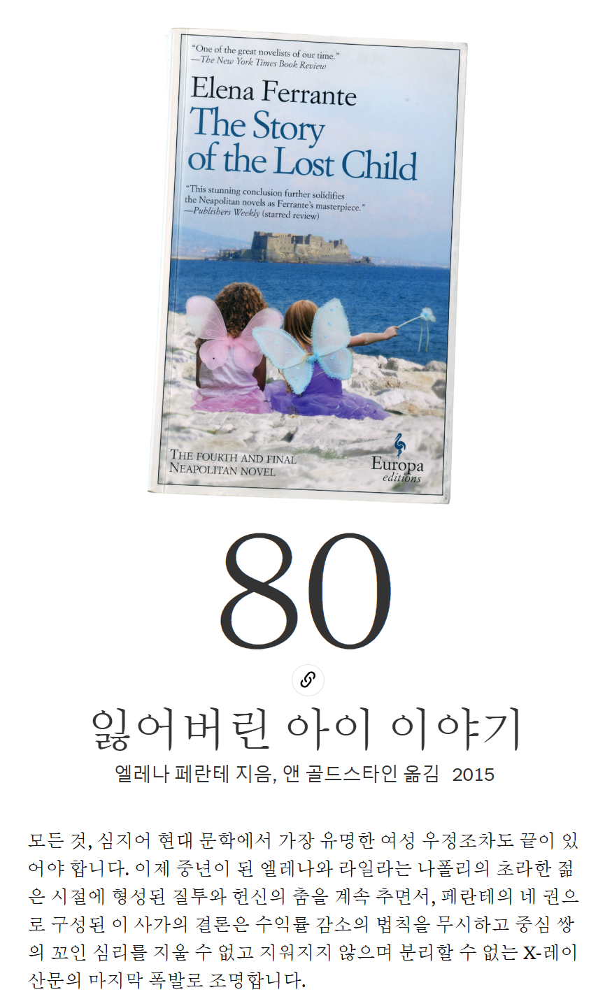 리뷰를 작성하자면, "The Story of the Lost Child"는 엘레나와 릴라의 복잡한 관계와 그들이 겪는 정신적, 감정적 도전을 섬세하게 묘사합니다. 페란테는 여성의 삶의 질감과 무한한 내면의 힘을 탐구하면서, 여성성의 미지의 영역에서 파워를 찾는다는 메시지를 전달합니다. 이 책은 두 여성의 삶을 통해 모성, 우정, 그리고 여성으로서의 정체성에 대한 깊은 성찰을 제공합니다. 페란테의 짧은 장들은 급변하는 사건들을 빠르게 전환하며 독자들을 이야기 속으로 끌어들입니다. 또한, 이 책은 엘레나와 릴라의 삶을 통해 나폴리의 역사와 문화를 생생하게 그려내며, 독자들에게 강렬한 인상을 남깁니다.