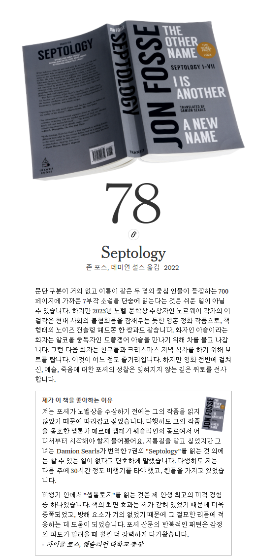 리뷰를 작성하자면, "Septology"는 존 포세의 작품 중에서도 특히 주목할 만한 작품으로, 그의 글은 부드러운 파도처럼 다가오지만 남기는 인상은 깊고 강렬합니다. 포세는 단순한 단어로 많은 것을 전달하며, 독자들로 하여금 명상과 같은 경험을 하게 만듭니다. 이 작품은 예술, 정체성, 가족 생활, 그리고 인간 생명 자체에 대한 노인의 반복적인 성찰을 통해 이미 주목받는 작가의 경력에 있어서 정점을 찍는 프로젝트로 평가받고 있습니다. "Septology"는 독특하고 명상적인 스타일로 인간의 본성에 대한 깊은 성찰을 제공하며, 독자들에게 잊을 수 없는 독서 경험을 선사합니다.