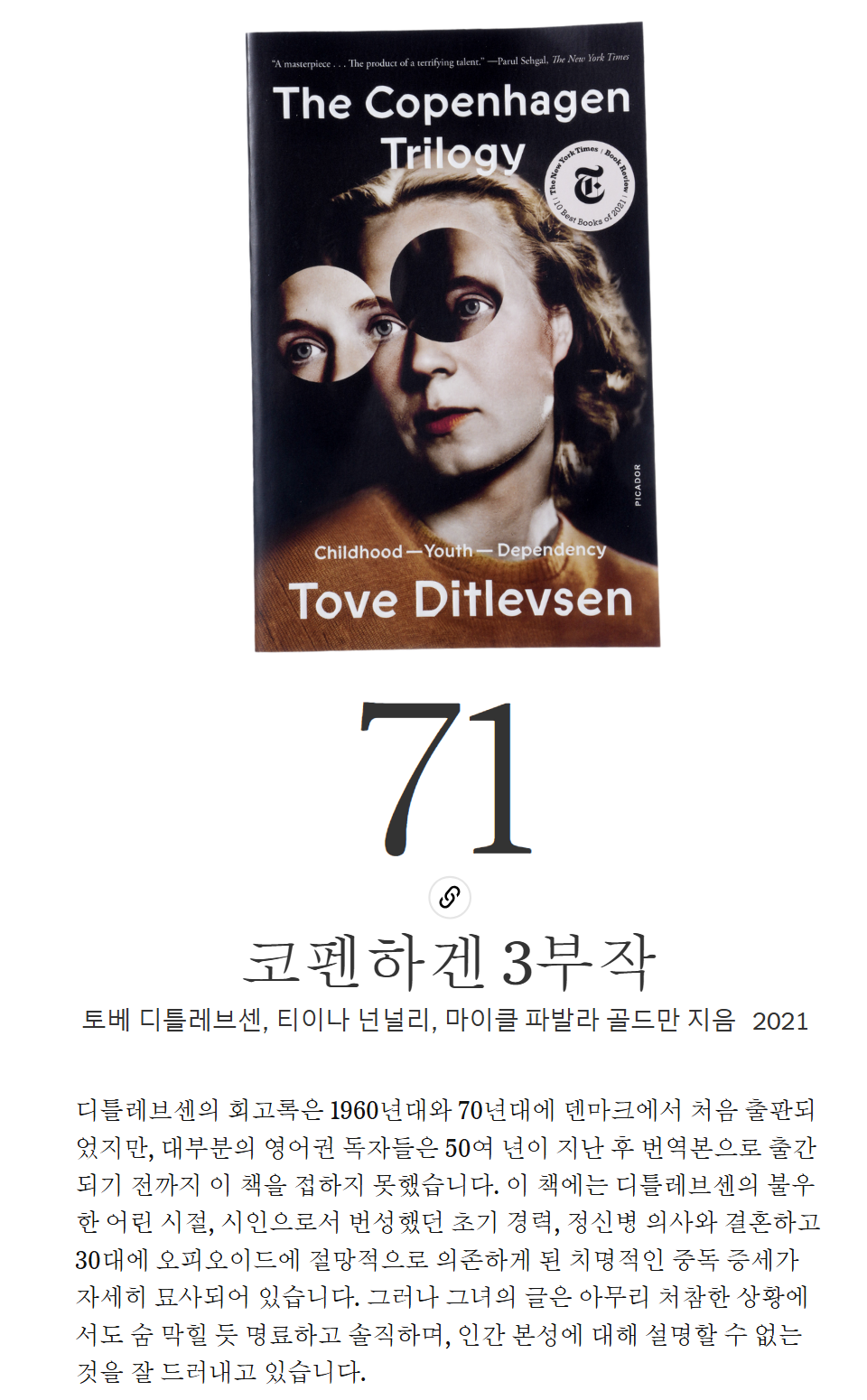 이 시리즈에 대한 리뷰를 작성하자면, "The Copenhagen Trilogy"는 디틀레브센의 삶의 여정을 통해 20세기 중반 덴마크 사회의 여성이 겪는 복잡한 감정과 관계를 섬세하게 그려냅니다. 그녀의 글은 자기 고백적이며, 때로는 가혹할 정도로 정직하고, 때로는 감동적입니다. 이 시리즈는 개인적인 경험을 통해 보편적인 진실을 탐구하며, 독자들에게 강렬한 인상을 남깁니다. 디틀레브센의 작품은 그녀의 삶의 특정 순간들을 생생하게 묘사하며, 그녀의 내면의 세계와 감정의 깊이를 드러냅니다. 이 책들은 덴마크 문학의 중요한 작품으로 평가받으며, 독자들에게 깊은 인사이트를 제공합니다.