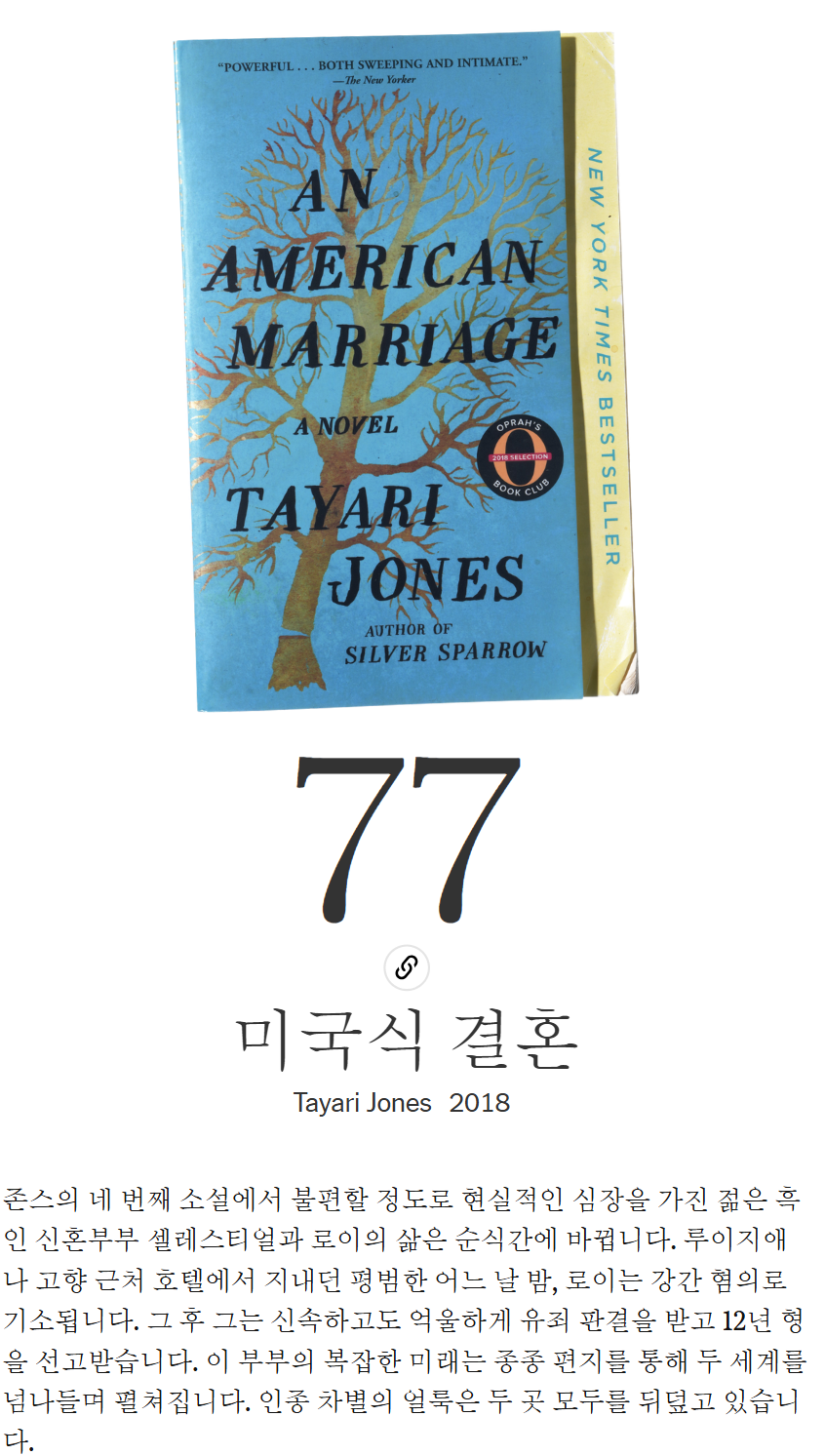 이 소설에 대한 리뷰를 작성하자면, "An American Marriage"는 미국의 형사 사법 시스템이 개인에게 미치는 개인적인 영향을 섬세하고 강력하게 다루고 있습니다. 이 소설은 사랑 이야기이지만, 인종적 불의에 의해 왜곡된 사랑 이야기입니다. 존스는 인종적 불의가 아프리카계 미국인의 이야기를 어떻게 괴롭히는지를 제안합니다.