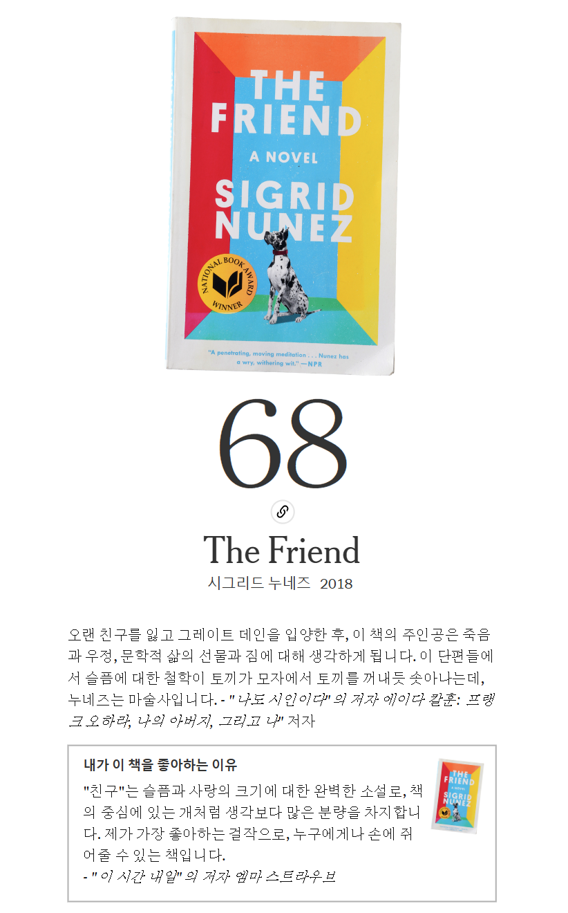 이 소설에 대한 리뷰를 작성하자면, "The Friend"는 슬픔과 치유에 대한 감동적인 탐구이자, 인간과 개 사이의 깊은 유대를 축하하는 작품입니다. 누네즈는 슬픔과 상실을 겪는 인물의 내면을 섬세하게 그려내며, 독자들에게 인간과 동물 사이의 관계가 어떻게 치유의 과정에 기여할 수 있는지를 보여줍니다. 이 소설은 인간의 고독과 상실감을 다루면서도, 사랑과 우정의 힘을 강조합니다. "The Friend"는 문학과 예술이 인간 경험을 어떻게 반영하고 풍부하게 하는지를 보여주는 독특하고 생각을 자극하는 작품입니다.