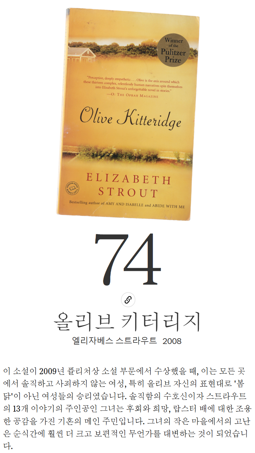 이 소설에 대한 리뷰를 작성하자면, "Olive Kitteridge"는 인간 조건에 대한 깊은 통찰을 제공하는 작품으로, 갈등, 비극, 기쁨, 그리고 그것을 견디는 데 필요한 인내력을 탐구합니다. 올리브는 때로는 엄격하고, 때로는 인내심이 강하며, 때로는 통찰력이 있고, 때로는 슬픈 부정에 빠져 있습니다. 그녀는 크로스비 마을과 세상의 변화를 싫어하지만, 주변 사람들의 변화를 항상 인식하지는 못합니다. 마을 사람들이 그들의 문제들, 경미한 것에서 심각한 것까지, 고민하면서 올리브는 때로는 고통스럽게, 하지만 항상 냉정한 정직함으로 자신과 자신의 삶에 대한 더 깊은 이해를 얻게 됩니다. 이 작품은 퓰리처 상을 수상했으며, HBO에서는 이 책을 바탕으로 미니시리즈를 제작하기도 했습니다.