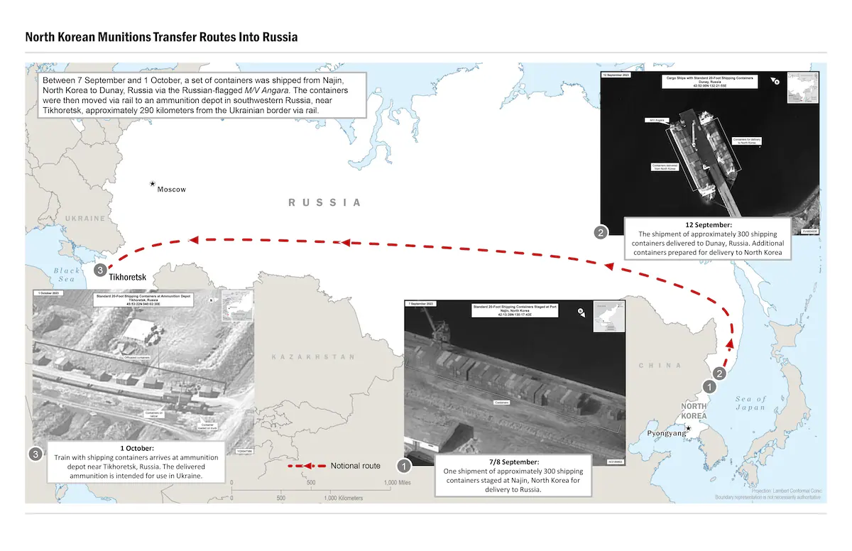 Intelligence images show what the United States claims are up to 1,000 containers of North Korean ammunition and other war materiel sent to aid Moscow’s war in Ukraine.