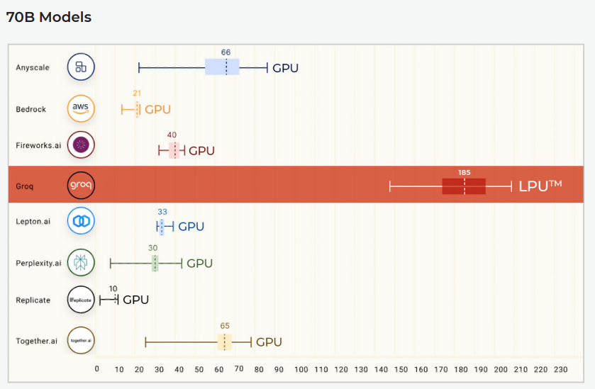막대 끝에 "GPU" 라벨이 표시된 것처럼 대부분의 모델은 GPU에서 실행됩니다. 그러나 Groq은 LPU™(독점 프로세서일 가능성이 높음)를 사용한다는 점에서 눈에 띕니다.