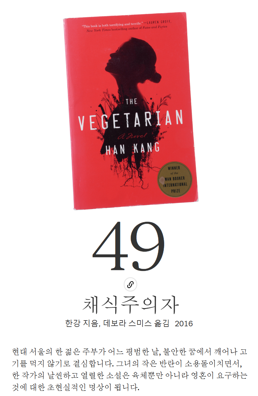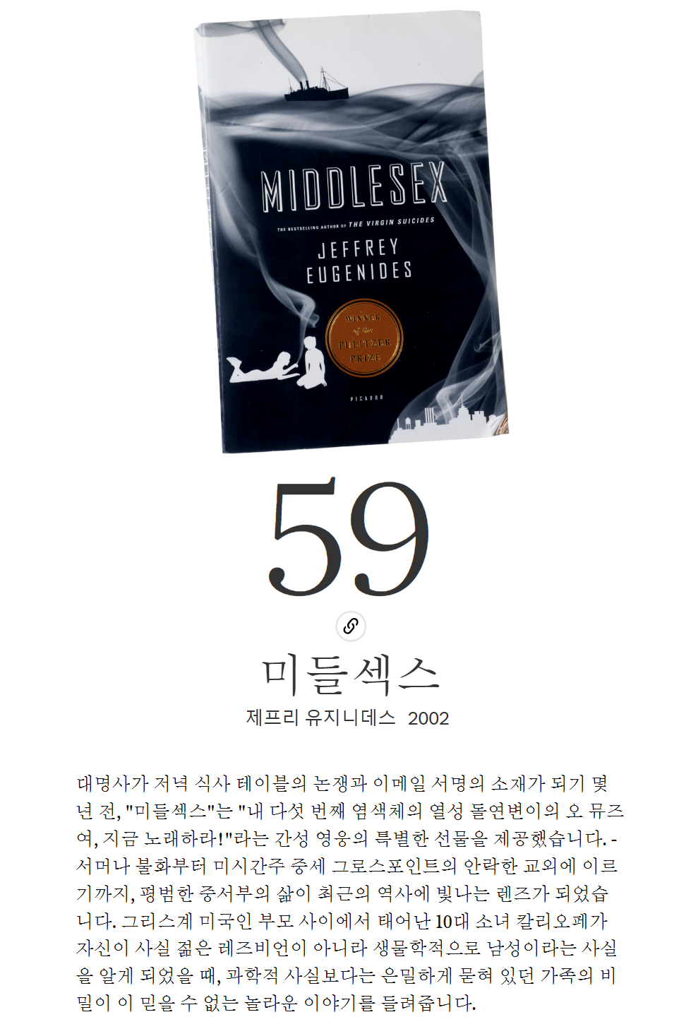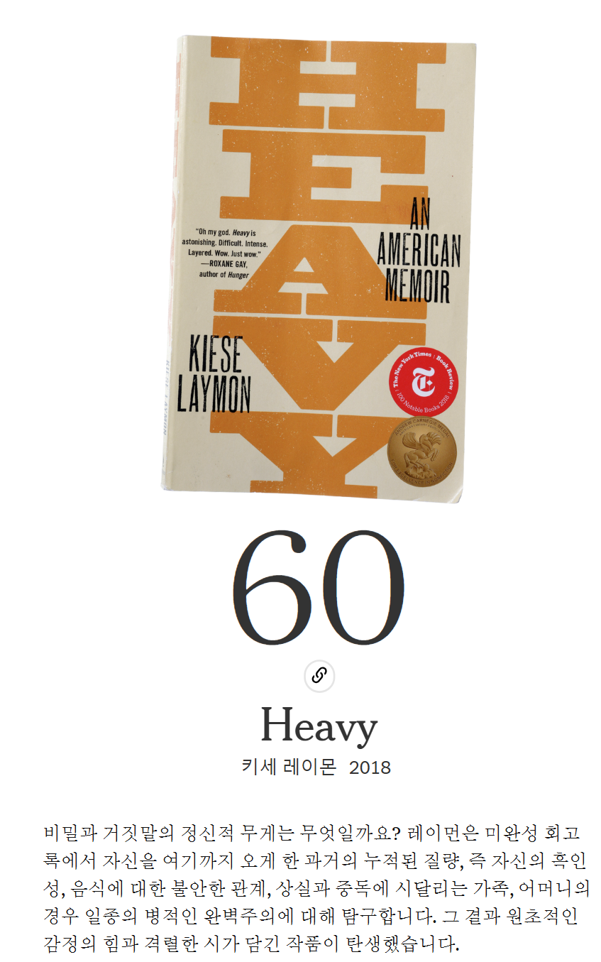 이번 주(오늘 60~41)에 걸쳐 이 목록을 공개하면서 꼭 읽어보고 싶었던 책을 발견하거나 다시 찾고 싶은 명작을 만나시길 바랍니다. 무엇보다도 여기 소개된 다양한 주제, 목소리, 의견, 경험, 상상력에서 여러분도 저희만큼이나 많은 영감을 얻고 눈부시게 빛나시길 바랍니다.
