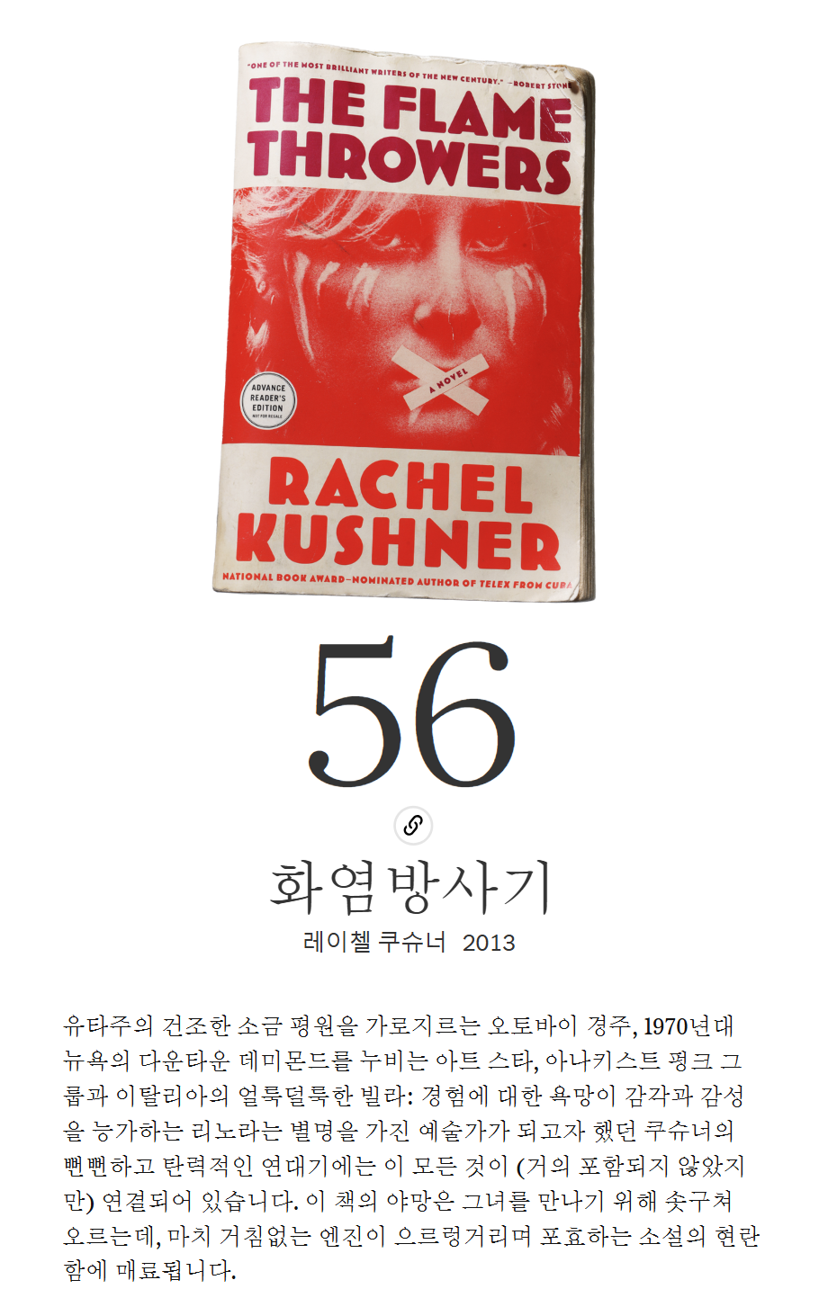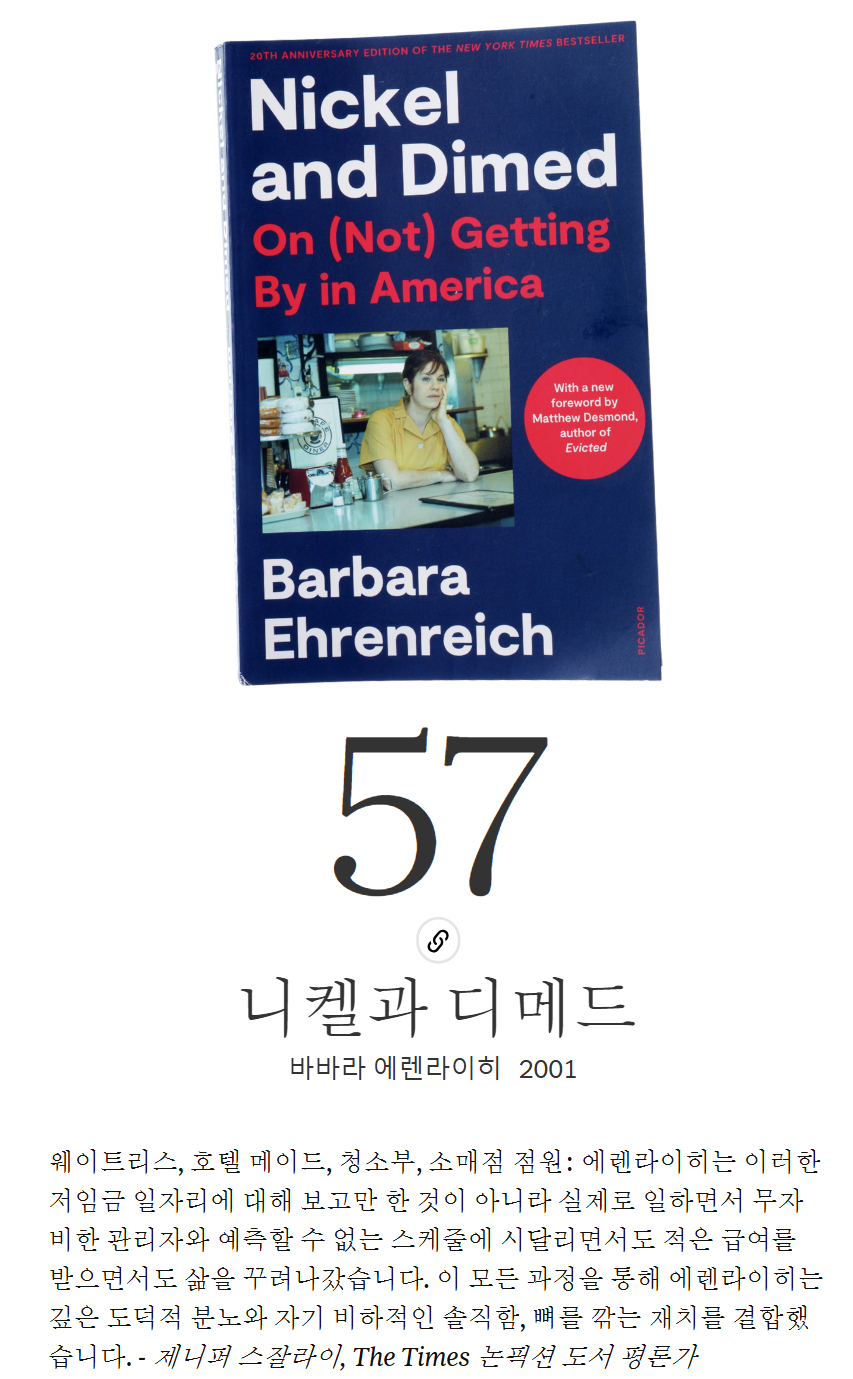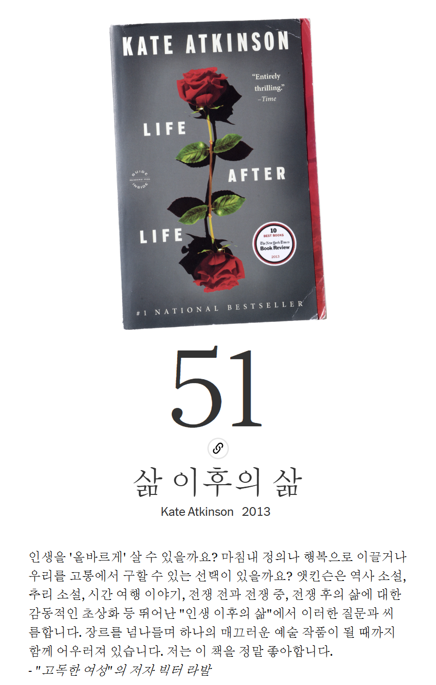 이번 주(오늘 60~41)에 걸쳐 이 목록을 공개하면서 꼭 읽어보고 싶었던 책을 발견하거나 다시 찾고 싶은 명작을 만나시길 바랍니다. 무엇보다도 여기 소개된 다양한 주제, 목소리, 의견, 경험, 상상력에서 여러분도 저희만큼이나 많은 영감을 얻고 눈부시게 빛나시길 바랍니다.