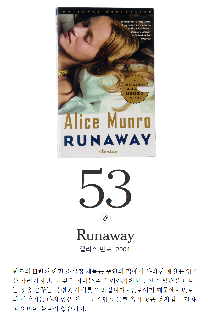 **“Runaway”**는 앨리스 먼로가 2004년에 출간한 단편 소설집으로, 인간 관계의 복잡성과 사랑의 배신을 탐구합니다. 이 책은 2009년 맨 부커 국제상을 수상했으며, 현대 단편 소설의 걸작으로 평가받고 있습니다.