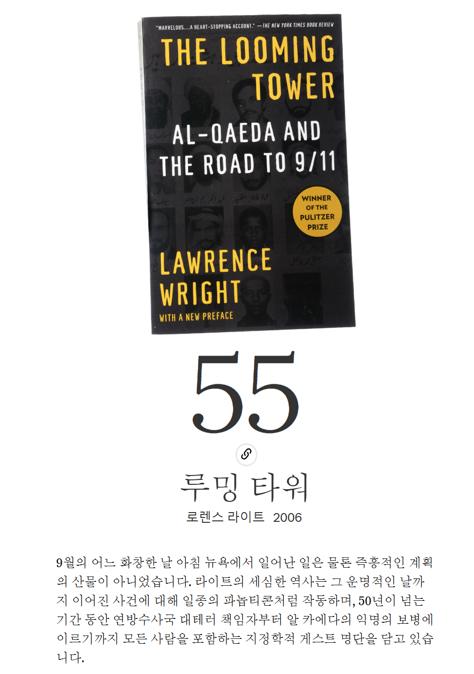 **“The Looming Tower: Al-Qaeda and the Road to 9/11”**는 로렌스 라이트가 2006년에 출간한 논픽션 책으로, 알카에다의 기원과 9/11 테러로 이어지는 사건들을 다룹니다. 이 책은 2007년 퓰리처상 일반 논픽션 부문을 수상했으며, 뉴욕 타임즈 베스트셀러에 올랐습니다.