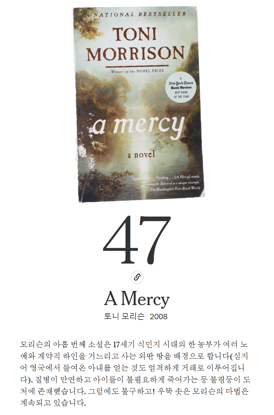 **“A Mercy”**는 토니 모리슨이 2008년에 출간한 소설로, 17세기 말 미국 식민지 시대를 배경으로 한 노예제와 인간 관계를 탐구합니다. 이 소설은 여러 인물의 시점을 통해 이야기가 전개되며, 복잡한 서사 구조와 깊이 있는 주제로 많은 독자들에게 큰 인상을 남겼습니다.
