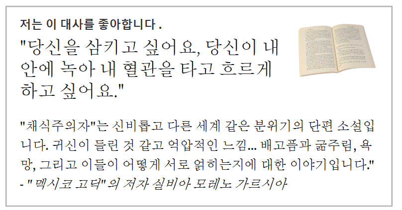 -“The Vegetarian”: 첫 번째 부분은 영혜의 남편인 청의 시점에서 이야기가 전개됩니다. 영혜는 어느 날 끔찍한 꿈을 꾼 후 갑자기 채식을 선언하고, 집안의 모든 고기를 버립니다. 남편과 가족은 그녀의 변화를 이해하지 못하고, 그녀를 강제로 고기를 먹이려 합니다.