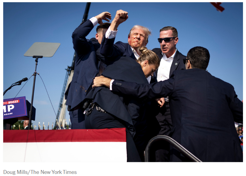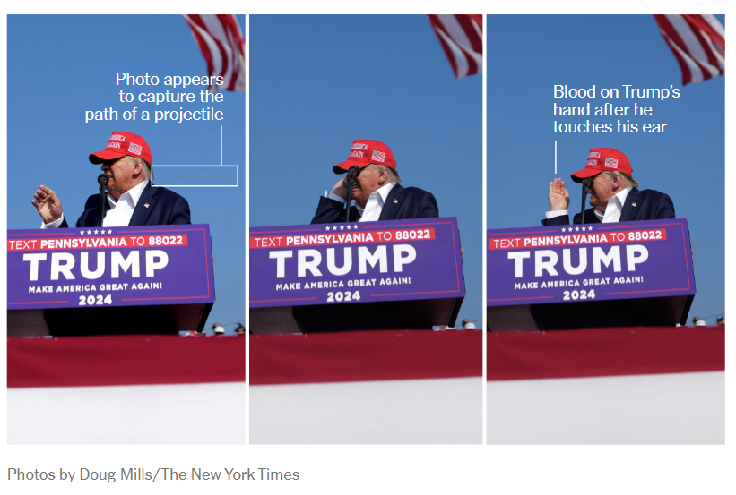 - 뉴욕타임스 사진작가인 더그 밀스의 사진은 트럼프 대통령의 머리를 지나가는 총알의 이미지를 포착한 것으로 보입니다.