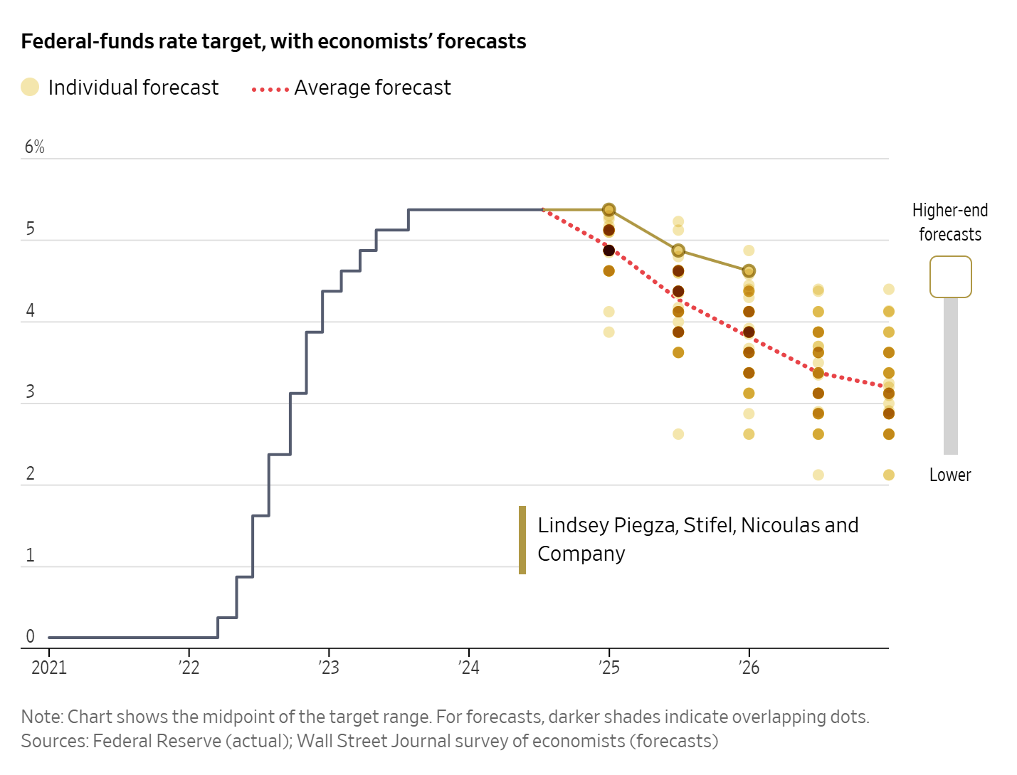 5. 개별 예측: 노란색과 갈색 점은 개별 경제학자의 예측을 나타내며, 다양한 의견을 보여줍니다. 특히 2026년에 대한 예측에는 상당한 편차가 있습니다.