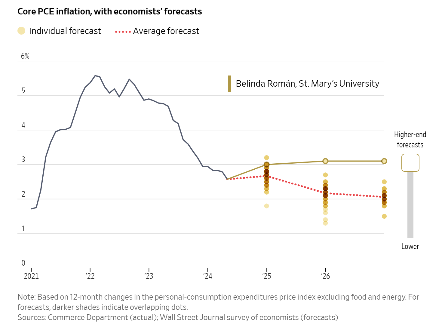 7. 더 높은 수준의 예측: 세인트 메리 대학교의 벨린다 로만 교수의 구체적인 전망은 2026년까지 핵심 PCE가 3%에 가깝게 유지되면서 약간 더 높은 인플레이션 전망을 보여줍니다.