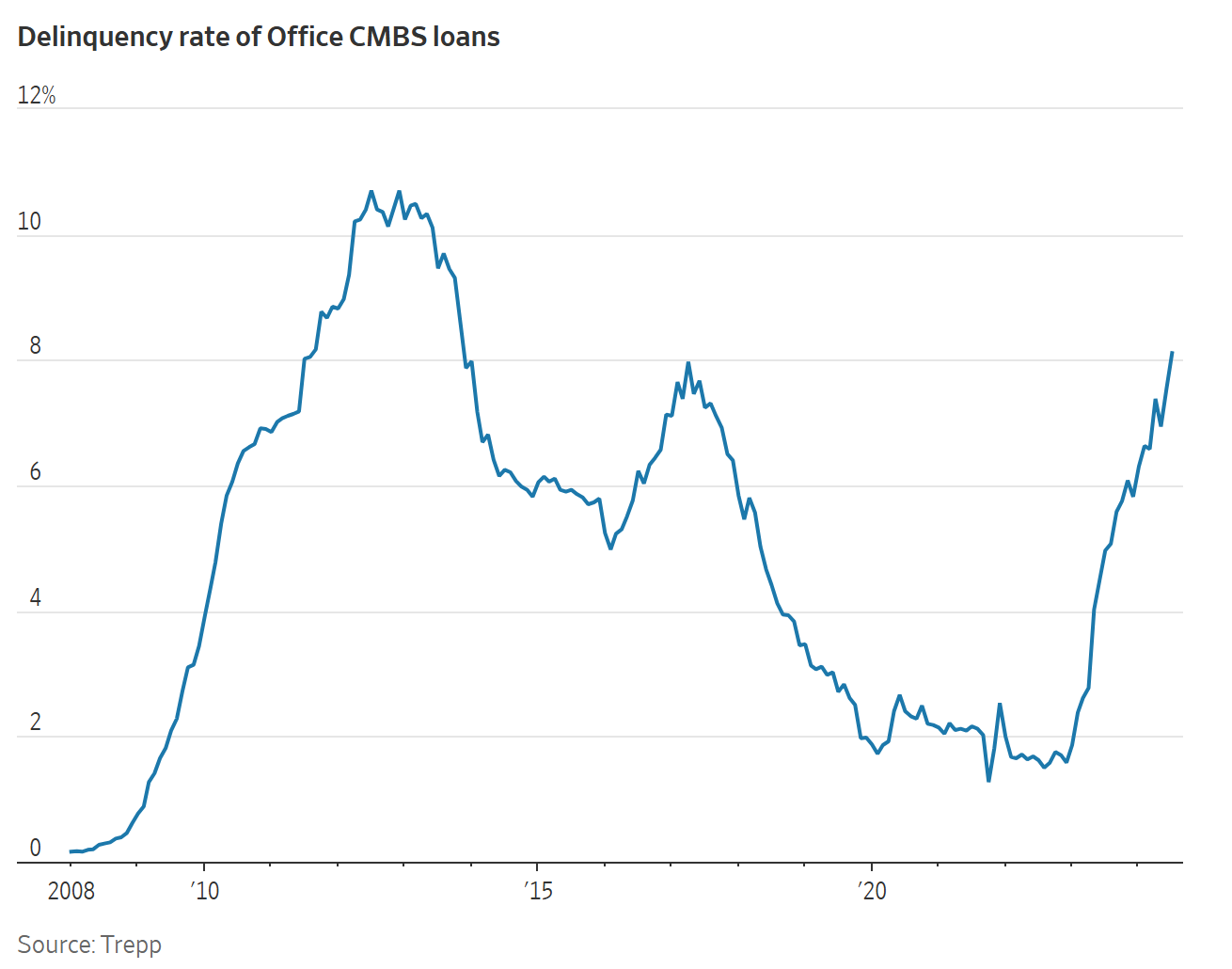 이 그래프는 2008년부터 현재까지 오피스 상업용 모기지담보증권(CMBS) 대출의 연체율을 보여줍니다. 주요 관찰 사항은 다음과 같습니다: