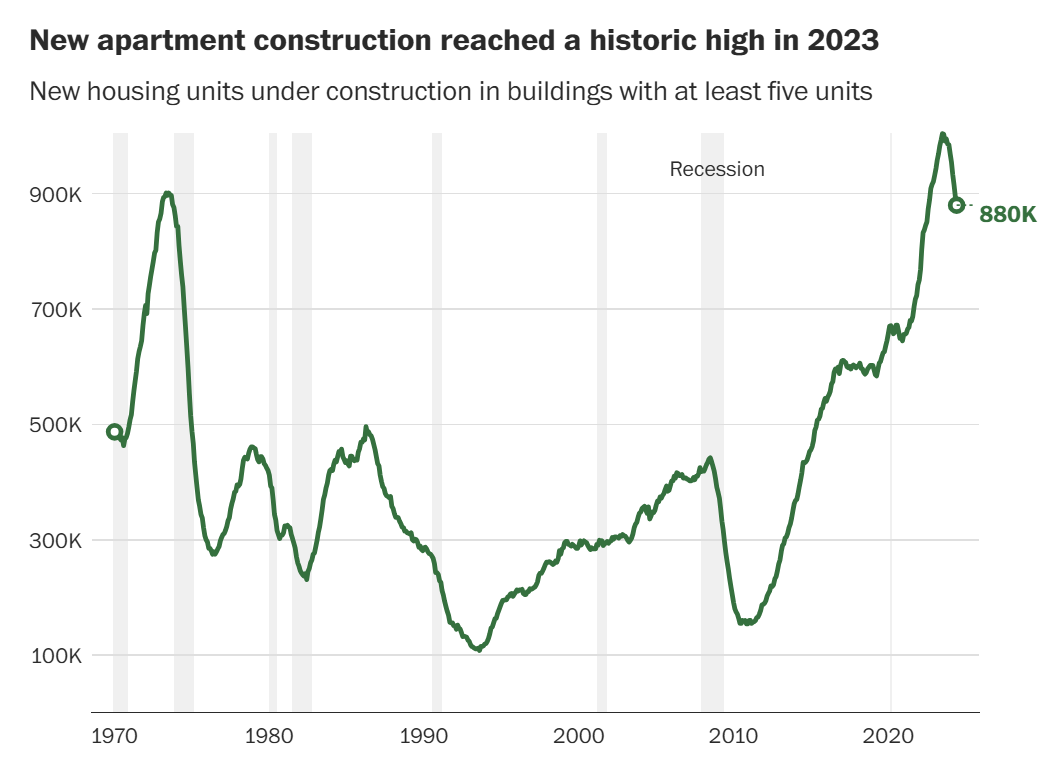 차트는 2023년에 신축 아파트 건설이 사상 최고치를 기록한 것을 보여줍니다. 1970년부터 2023년까지 최소 5개 유닛이 있는 건물의 신축 주택 수를 나타내며, 2023년에 약 88만 유닛으로 최고점을 찍었습니다. 그래프는 경제 침체기 동안의 큰 하락을 포함하여 시간에 따른 변동을 보여줍니다.