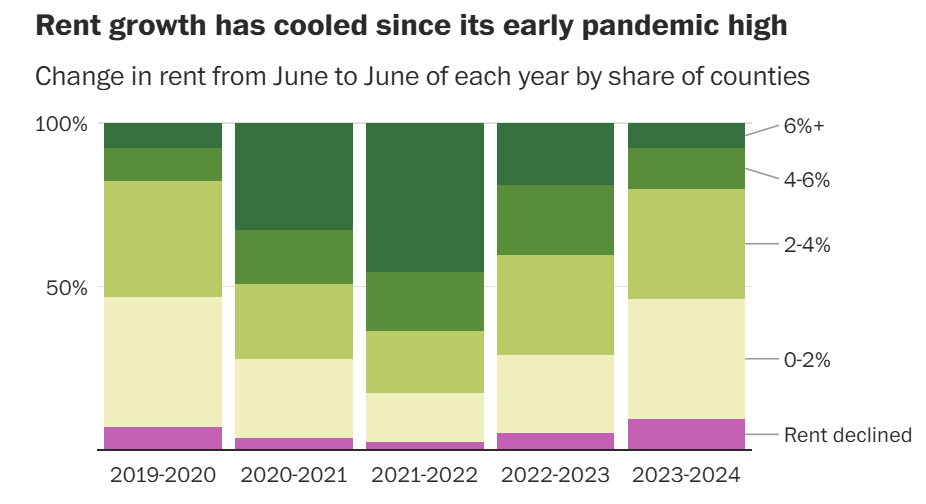이 이미지는 2019년부터 2024년까지 매년 6월부터 다음 해 6월까지의 미국 카운티별 임대료 변동을 비율로 나타낸 막대 그래프입니다. 그래프는 팬데믹 초기의 임대료 급등 이후 임대료 상승세가 둔화된 현상을 보여줍니다.