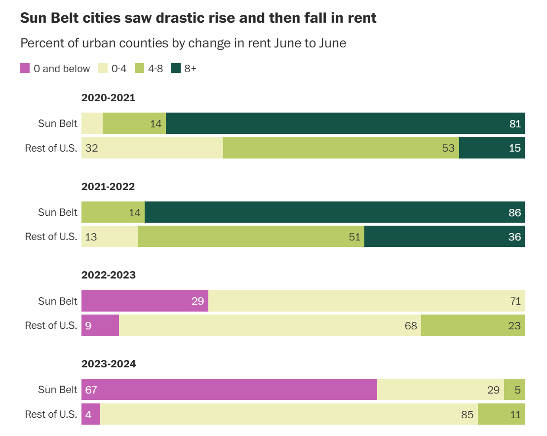 차트는 **“Sun Belt 도시의 임대료 급등 및 하락 비율”**을 보여줍니다. 각 연도별로 임대료 변화율을 네 가지 범주로 나누어 나타내고 있습니다: 0 이하, 0-4%, 4-8%, 8% 이상.