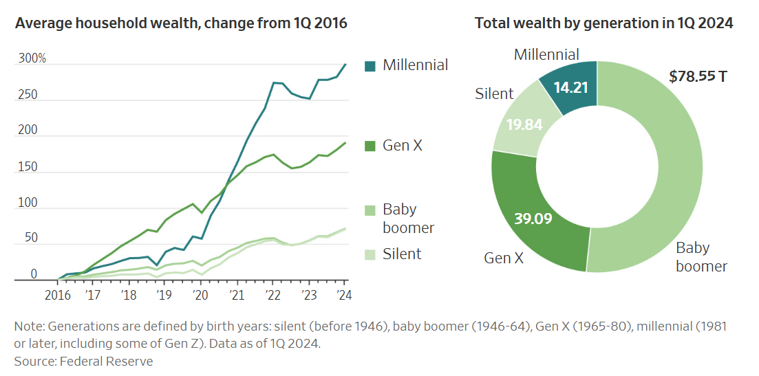 - 밀레니얼 세대의 자산 증가율이 가장 높지만, 여전히 베이비부머 세대가 가장 많은 자산을 보유하고 있습니다.