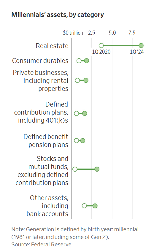- 2020년 1분기에는 약 5조 달러의 자산을 보유하고 있었으나, 2024년 1분기에는 약 7.5조 달러로 증가했습니다. 부동산이 밀레니얼 자산에서 가장 큰 비중을 차지하고 있습니다.
