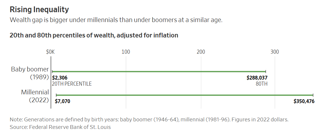 이 차트는 세대 간 부의 불평등 증가를 보여줍니다. 특히, 베이비부머 세대(1989년 기준)와 밀레니얼 세대(2022년 기준)에서 부의 20번째 백분위수와 80번째 백분위수의 차이를 비교하여 부의 격차를 나타냅니다.