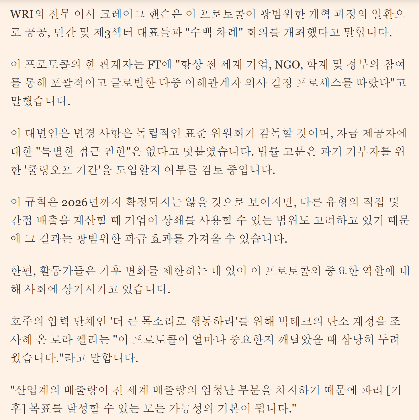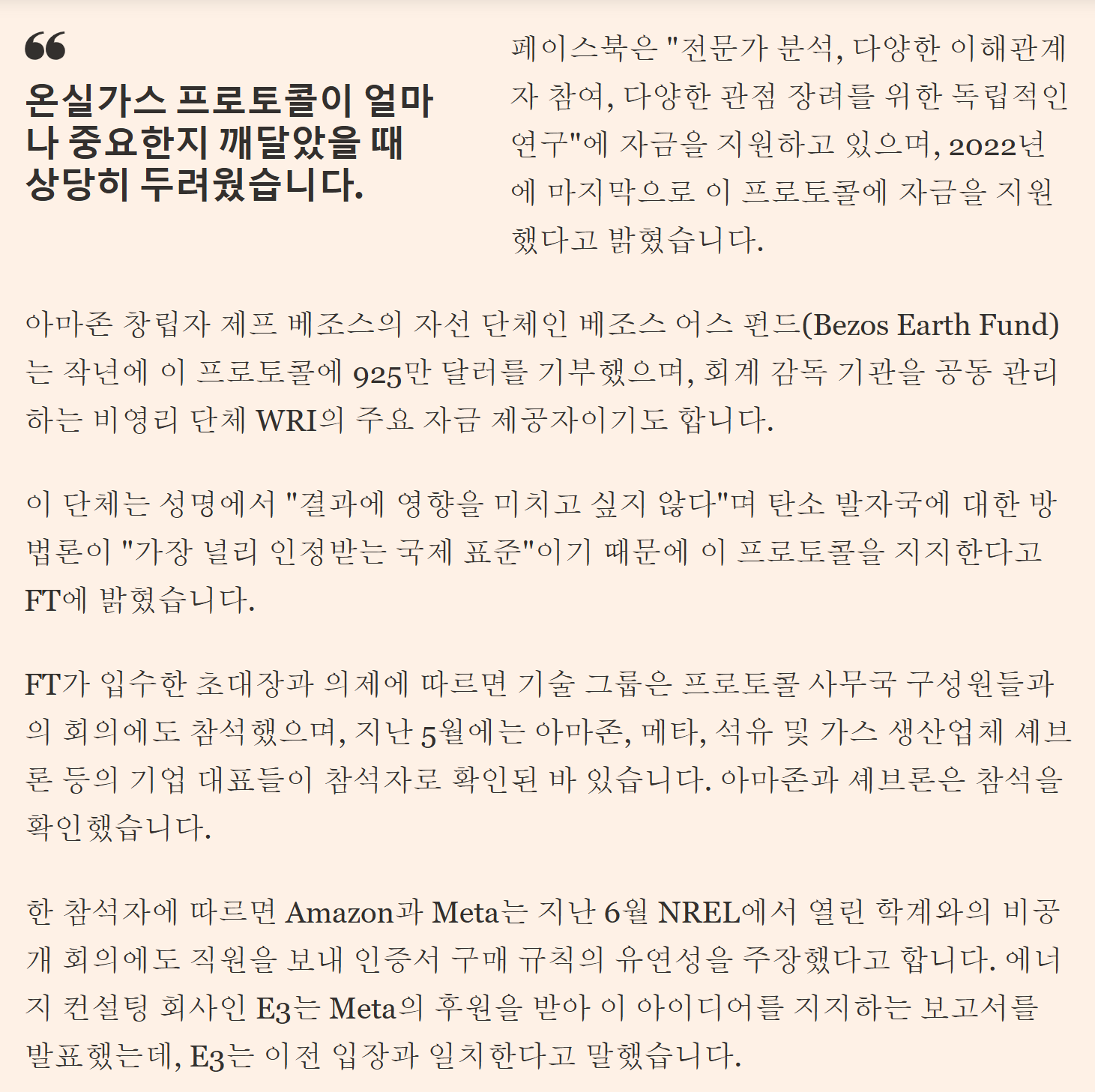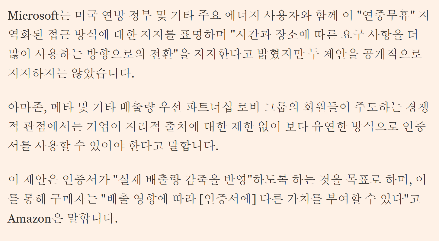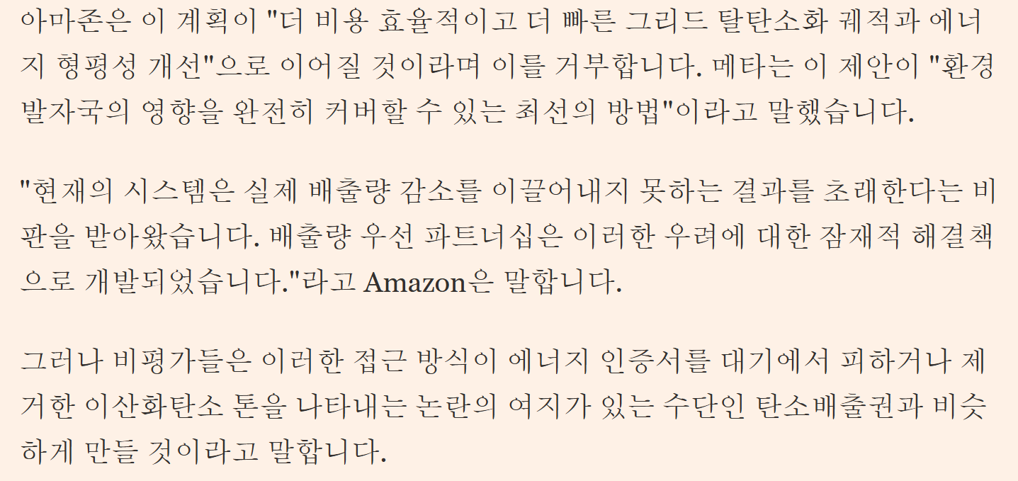 - 대기업의 배출량 보고: 아마존과 메타 같은 대기업들이 온실가스 배출량을 보고하는 방식을 바꾸려 하고 있습니다. 이들은 재생 에너지 투자로 실제 배출량을 상쇄하려고 합니다.