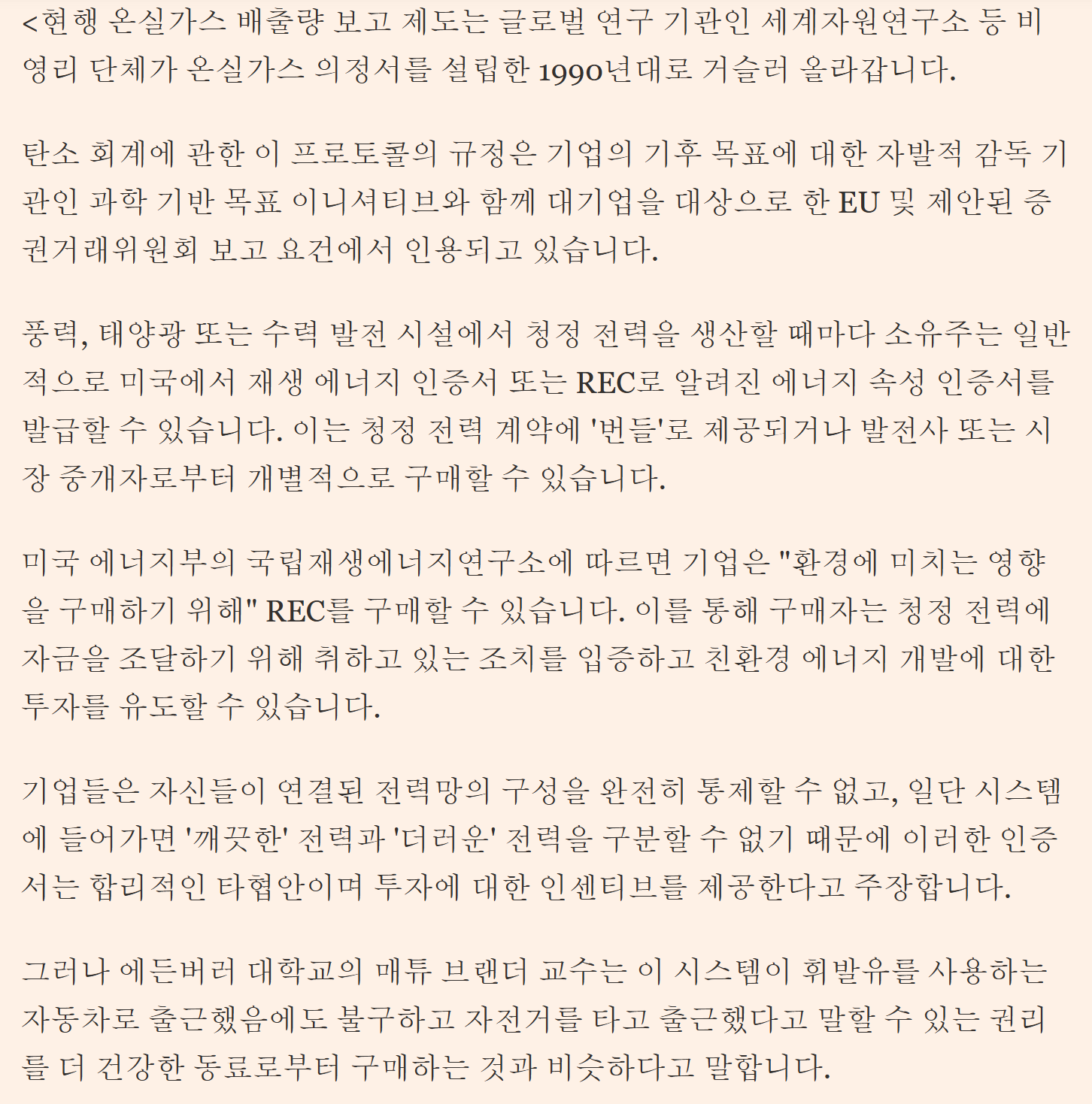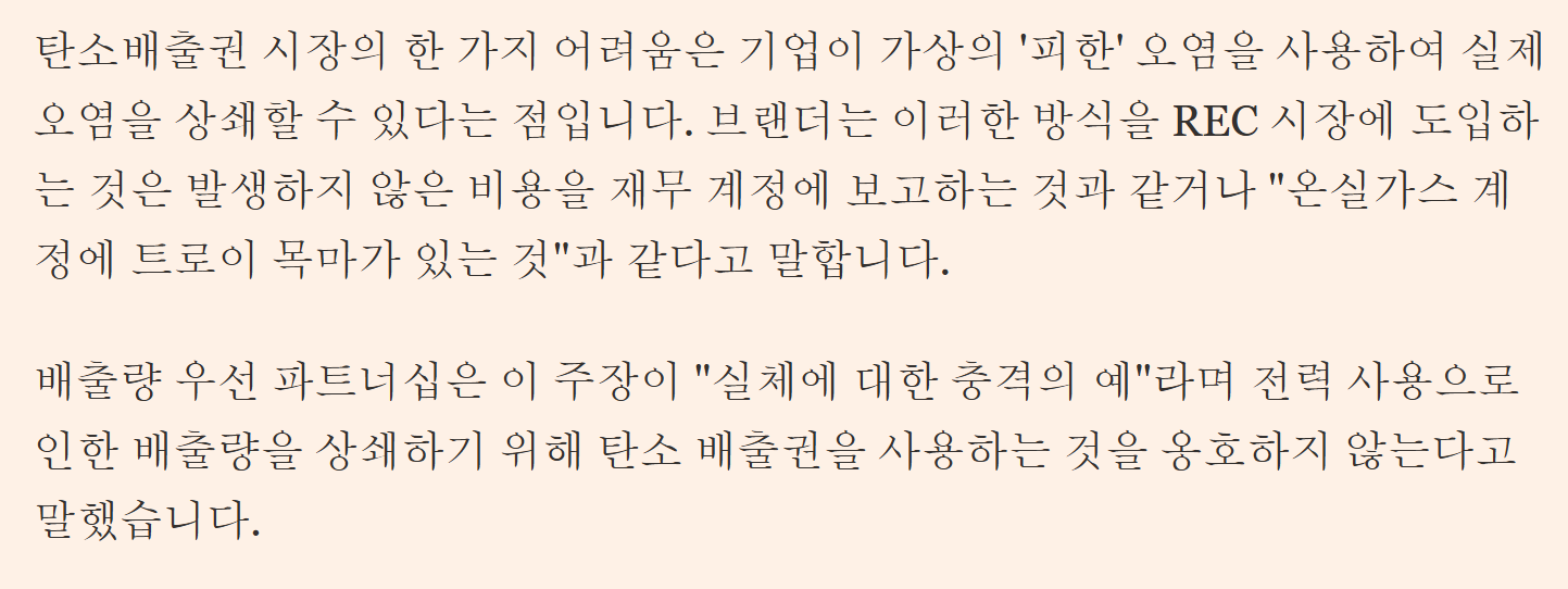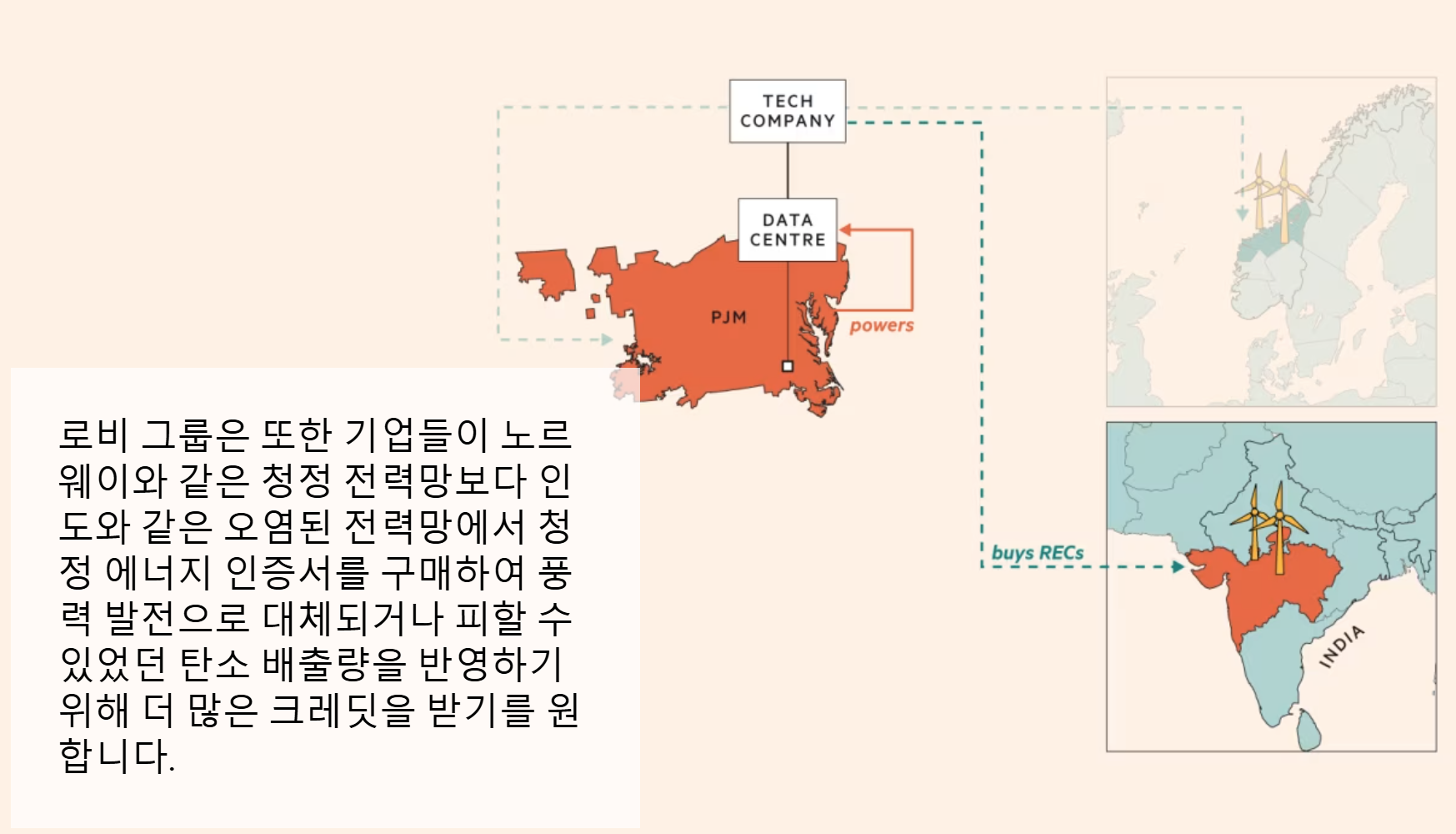 - 재생 에너지 인증서: 재생 에너지 인증서(RECs)를 통해 기업들이 배출량을 상쇄하려 하지만, 이 시스템의 효과에 대한 의문이 제기되고 있습니다.