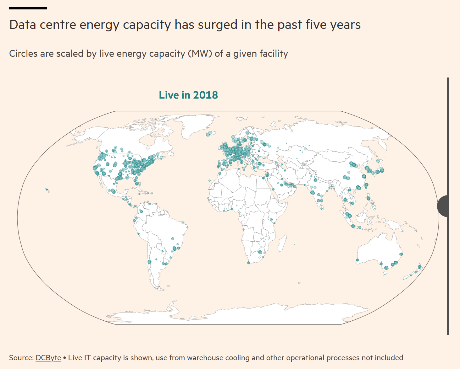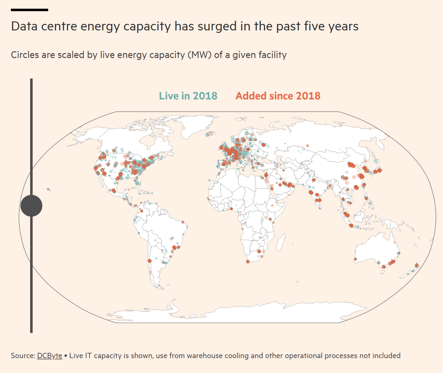 이 비주얼라이제이션은 데이터센터 용량이 전 세계적으로 빠르게 확장되고 있음을 효과적으로 보여주며, 업계의 기존 시장과 신흥 시장을 모두 강조합니다.